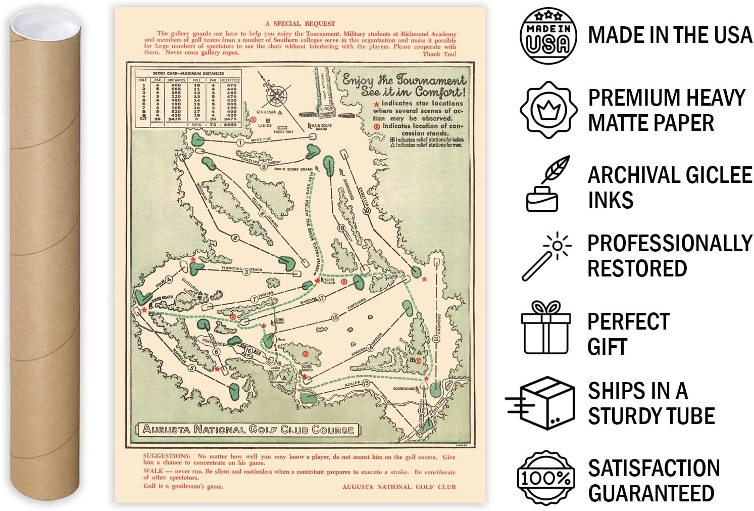 - VINTAGE GOLF MAP REPRODUCTION: 1954 Masters Golf Tournament map showinghole distances, best viewing locations, and radio scoreboards. There is also some advice on fan etiquette.