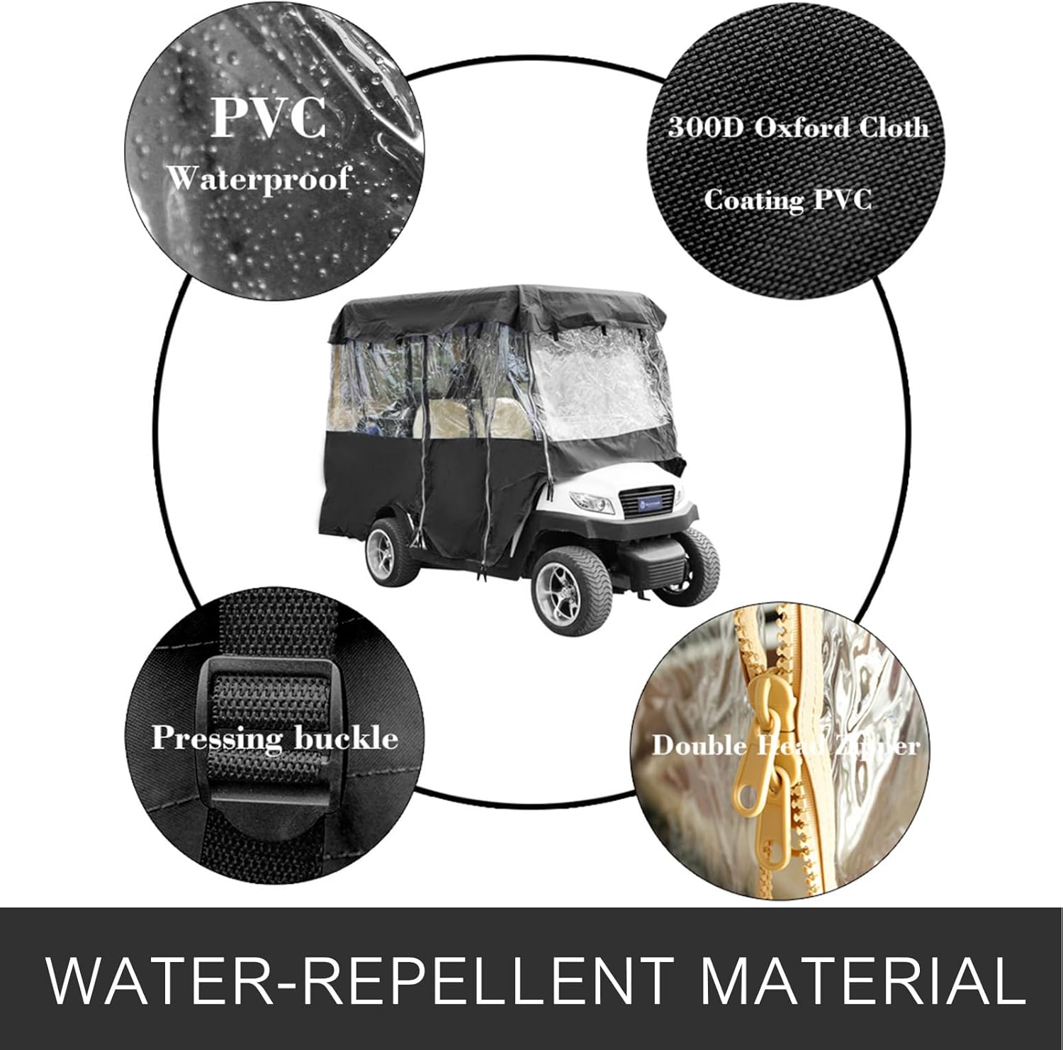 - Transparent PVC Window: Super-clear PVC windows allow for better visibility. This cart cover is able to keep you away from serious weather. Maximum visibility is still ensured while you are inside the cart.