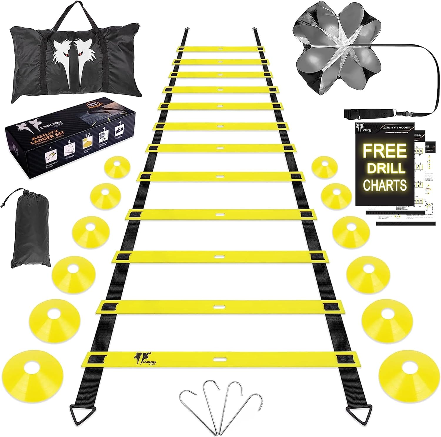 20ft Sports Agility Ladder for Men Women and Kids, Speed Youth Soccer Agility Training Equipment for Football, Exercise, Tennis, Legs Workout with Speed Parachute and Carry Bag