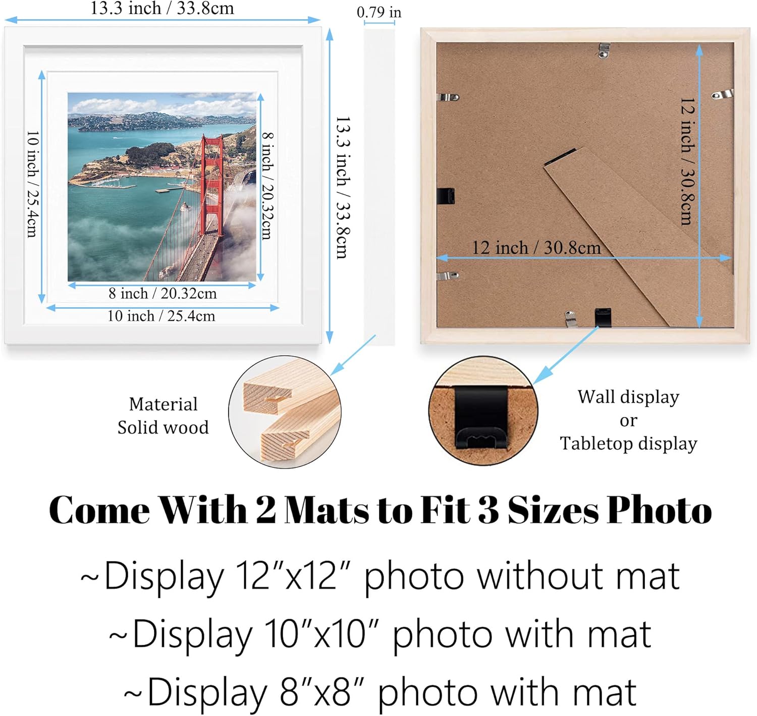- 『Size Of Frame』Outer Dimensions: 13.3x13.3 Inch / 33.8x33.8cm,Inner Dimension: 12x12 Inch / 30.5x30.5cm,This 12x12 inch Square Picture Frames To Without Mat Display: 11.6x11.6 Inch / 29.5x29.5cm,With 2 Mats Display: 8x8 Inch or 10x10 Inch.Flexible Fits 3 Sizes Photo.(Note:Actual mat opening size are about 9.75x9.75” and 7.75x7.75”)