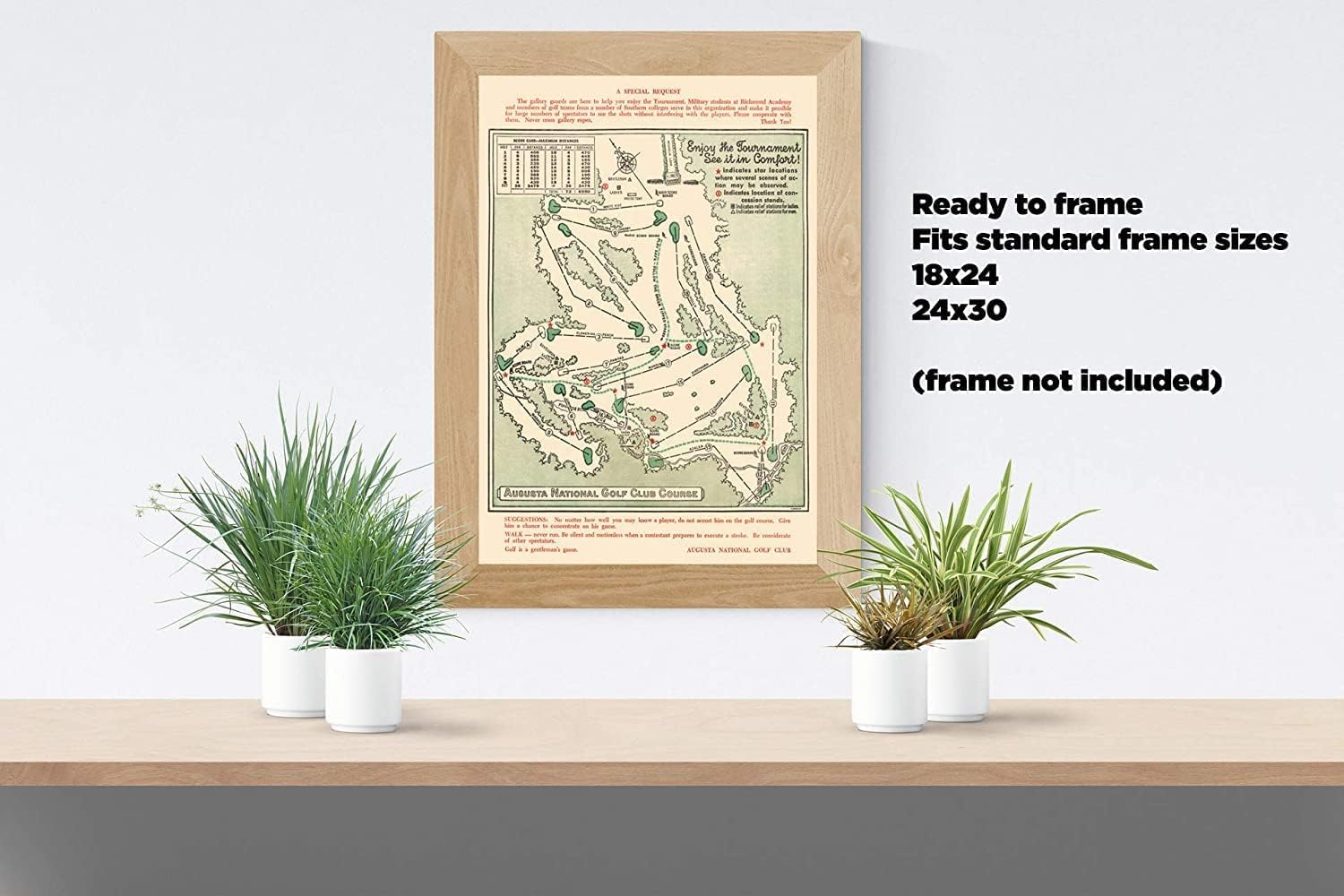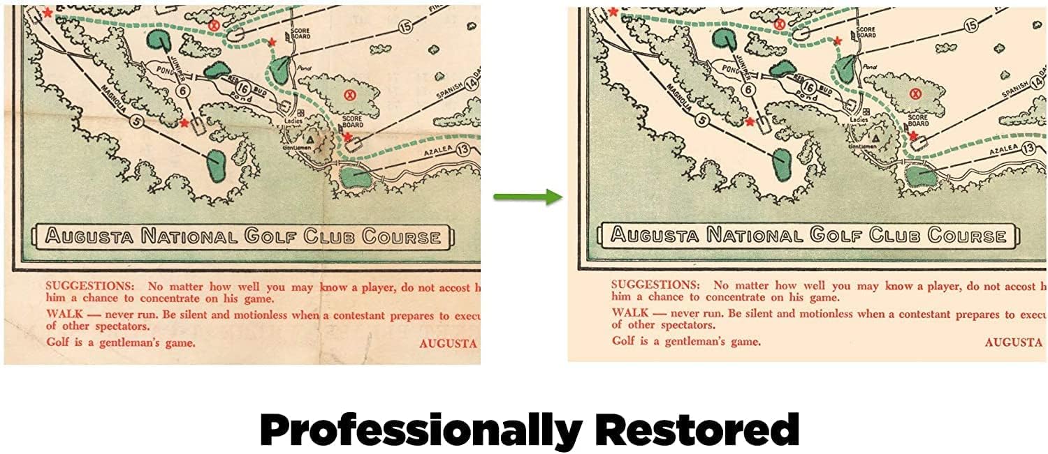 - VINTAGE GOLF MAP REPRODUCTION: 1954 Masters Golf Tournament map showing hole distances, best viewing locations, and radio scoreboards. Masters spectator guide with tips on fan etiquette.