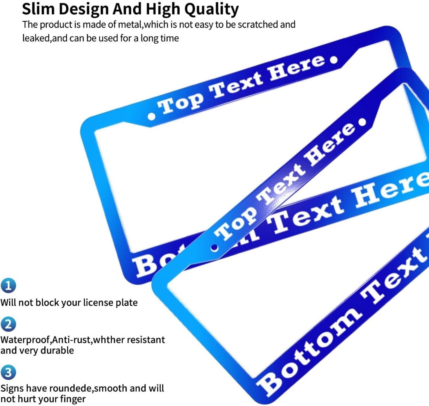 - 🚗PREMIUM QUALITY: Customizable license plate frames are made of aluminum,no rust, light and durable.Fit all standard size 12”x6” license plates