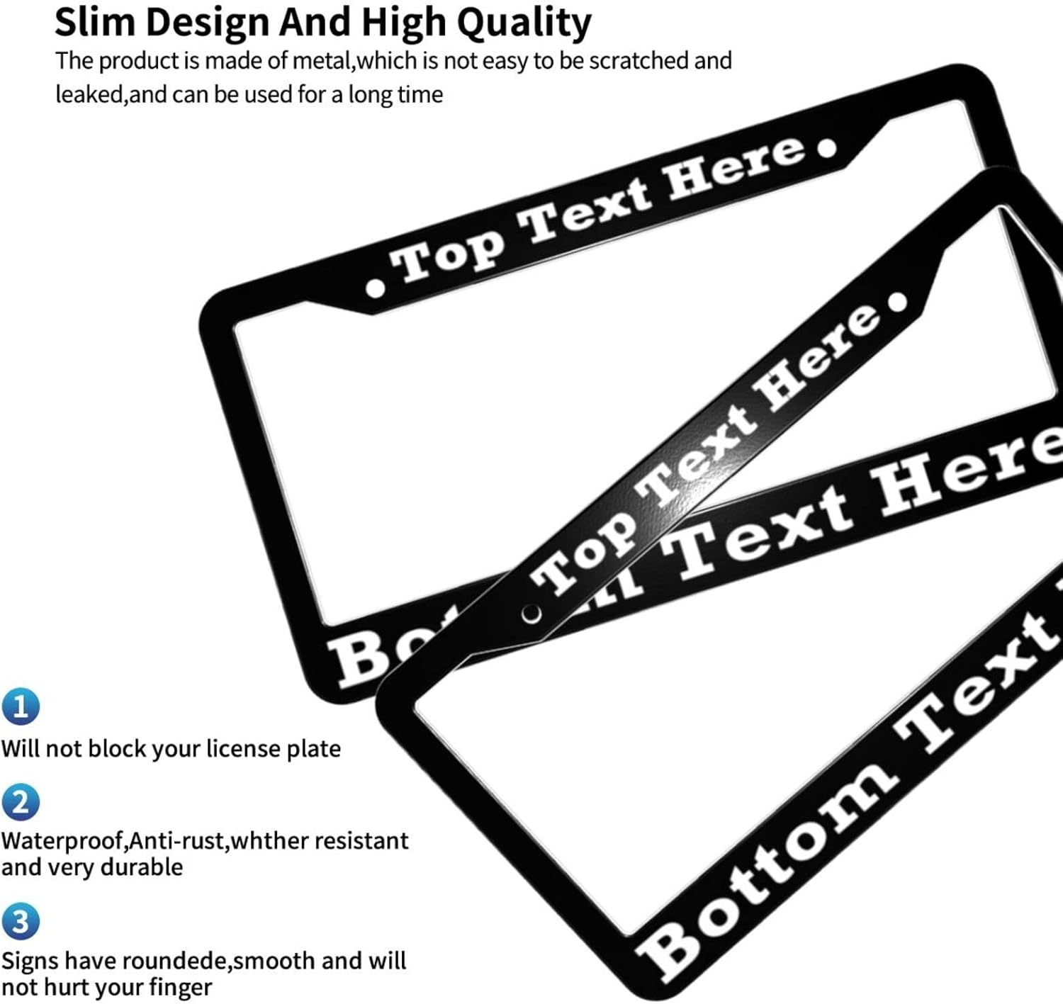 - 🚗PREMIUM QUALITY: Customizable license plate frames are made of aluminum,no rust, light and durable.Fit all standard size 12”x6” license plates