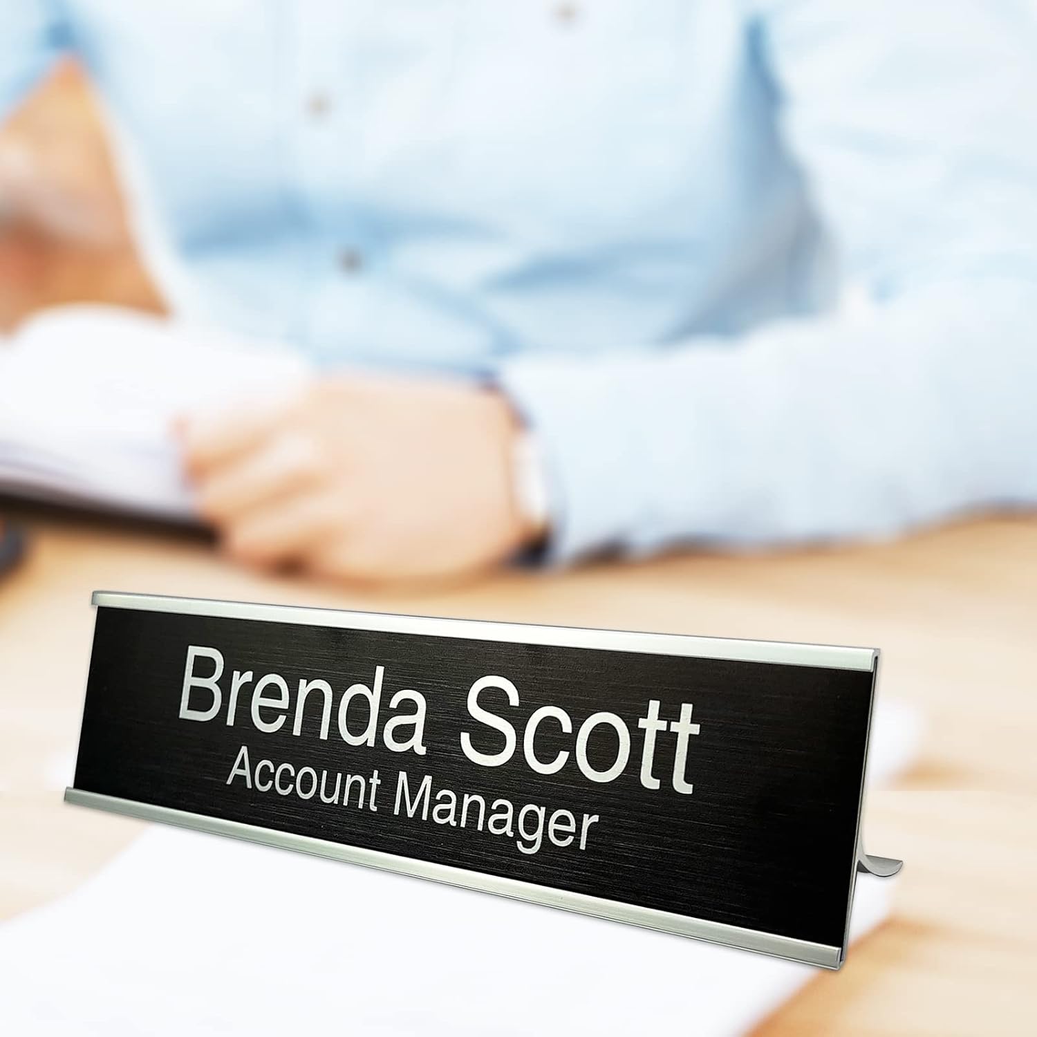 - Personalized Design:These name plates for desk, wall or door. Each name plate up to 2 lines, and up to 35 characters per line. The customized texts are clear, never fade. The name plate can be wall-mounted or sit on a desk, making your office look more professional.