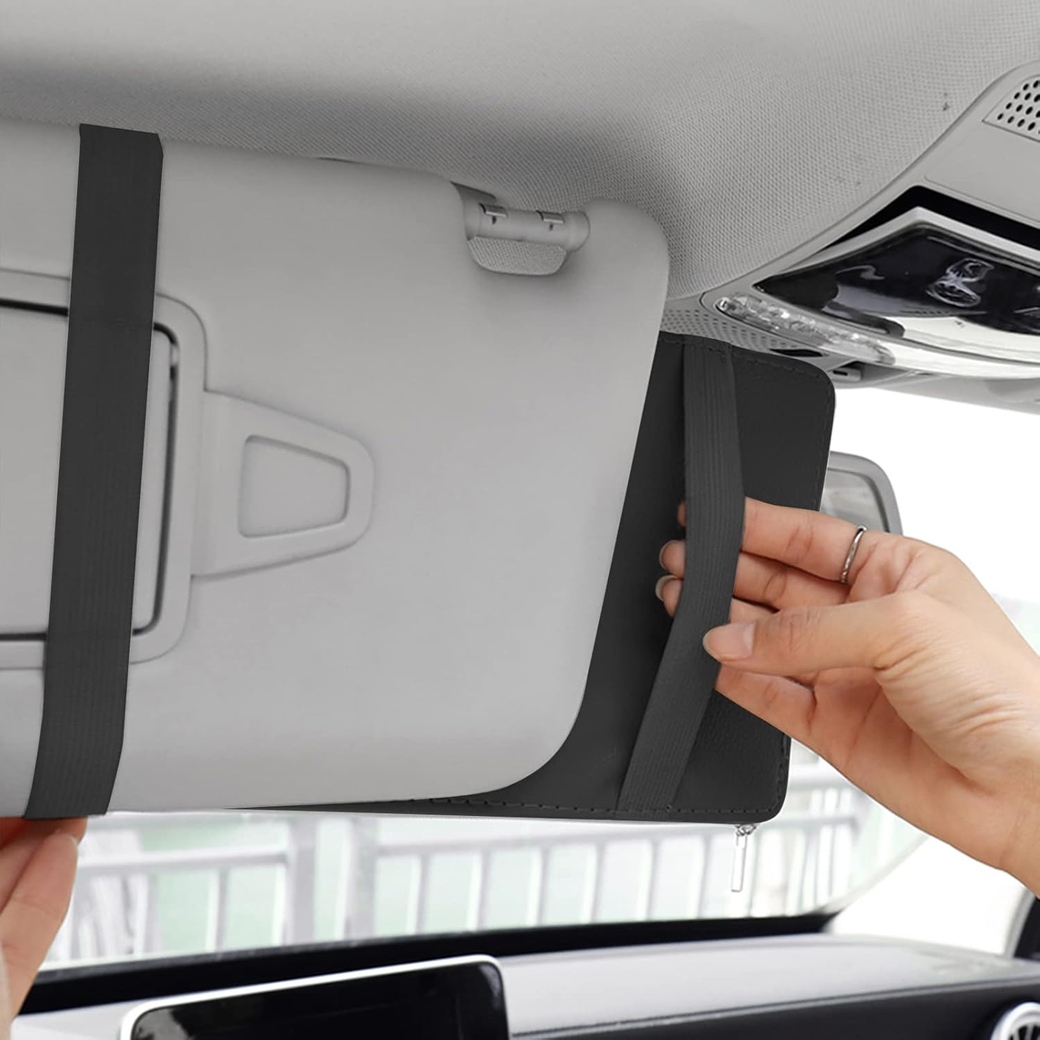 - The Car Sun Visor Storage Organizer Made of durable PU Leather. Fine leather veins blend with your car. Large capacity car sun visor organizer keep your car clean and tidy, provides an extra storage space for your cars, convenient to place small items.