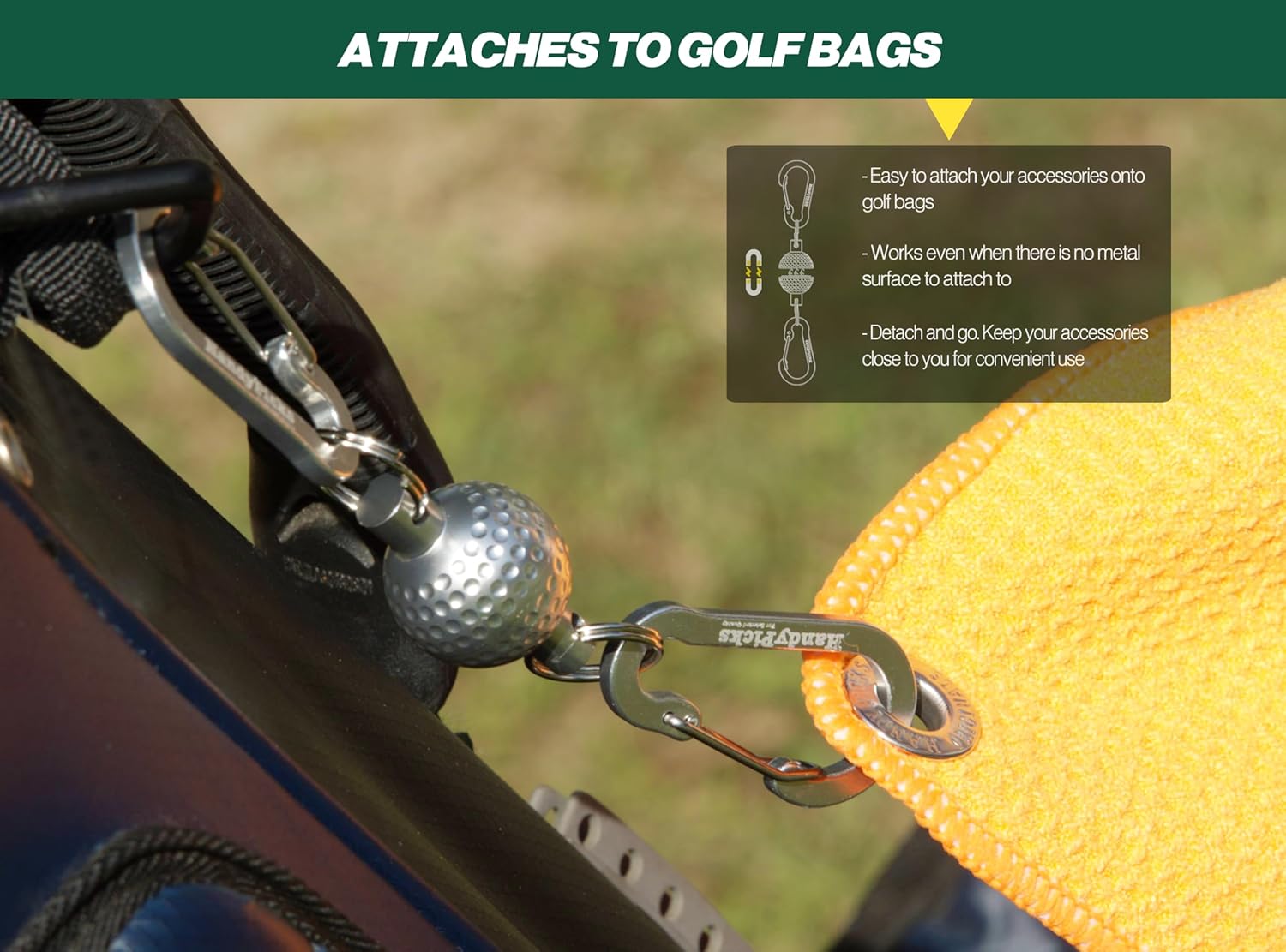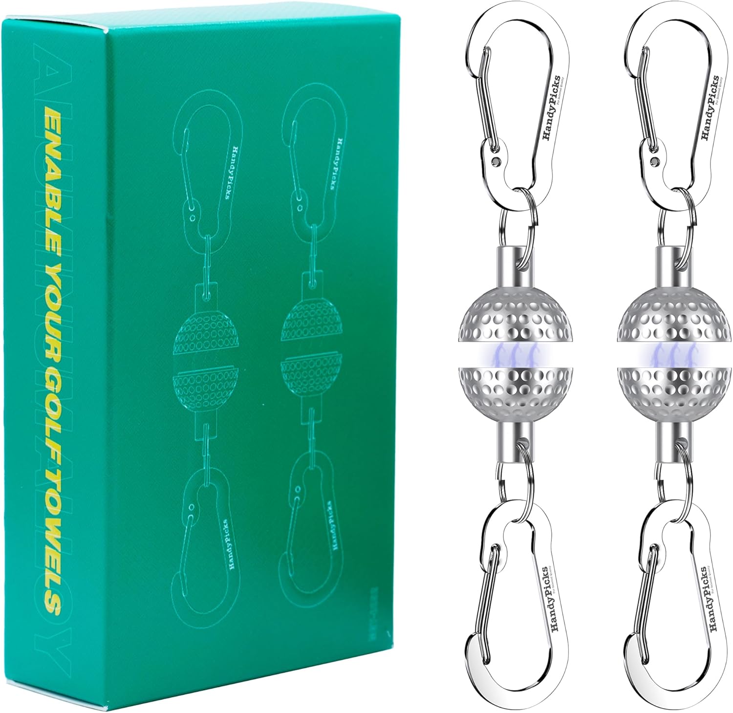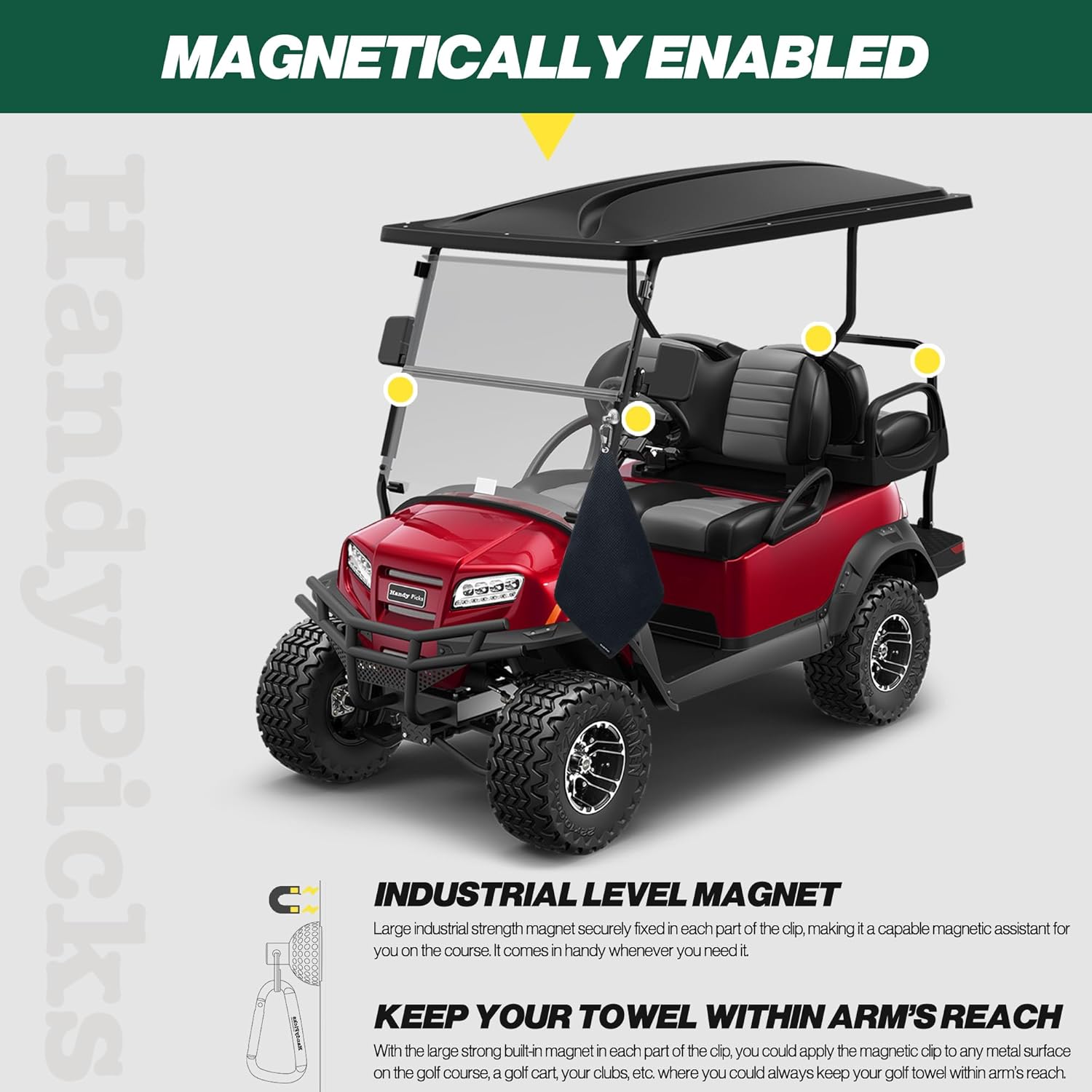- The Original Magnetic Clip for Golf Towels: this is Handy Picks Golf most up to date magnetic clip for golf towels. It is designed to turn any golf towels with an eyelet into magnetic golf towels. It consists of 2 parts, inside of each part, there is an industrial level strong magnet securely fixed inside so that they can be securely fixed on metal surfaces.