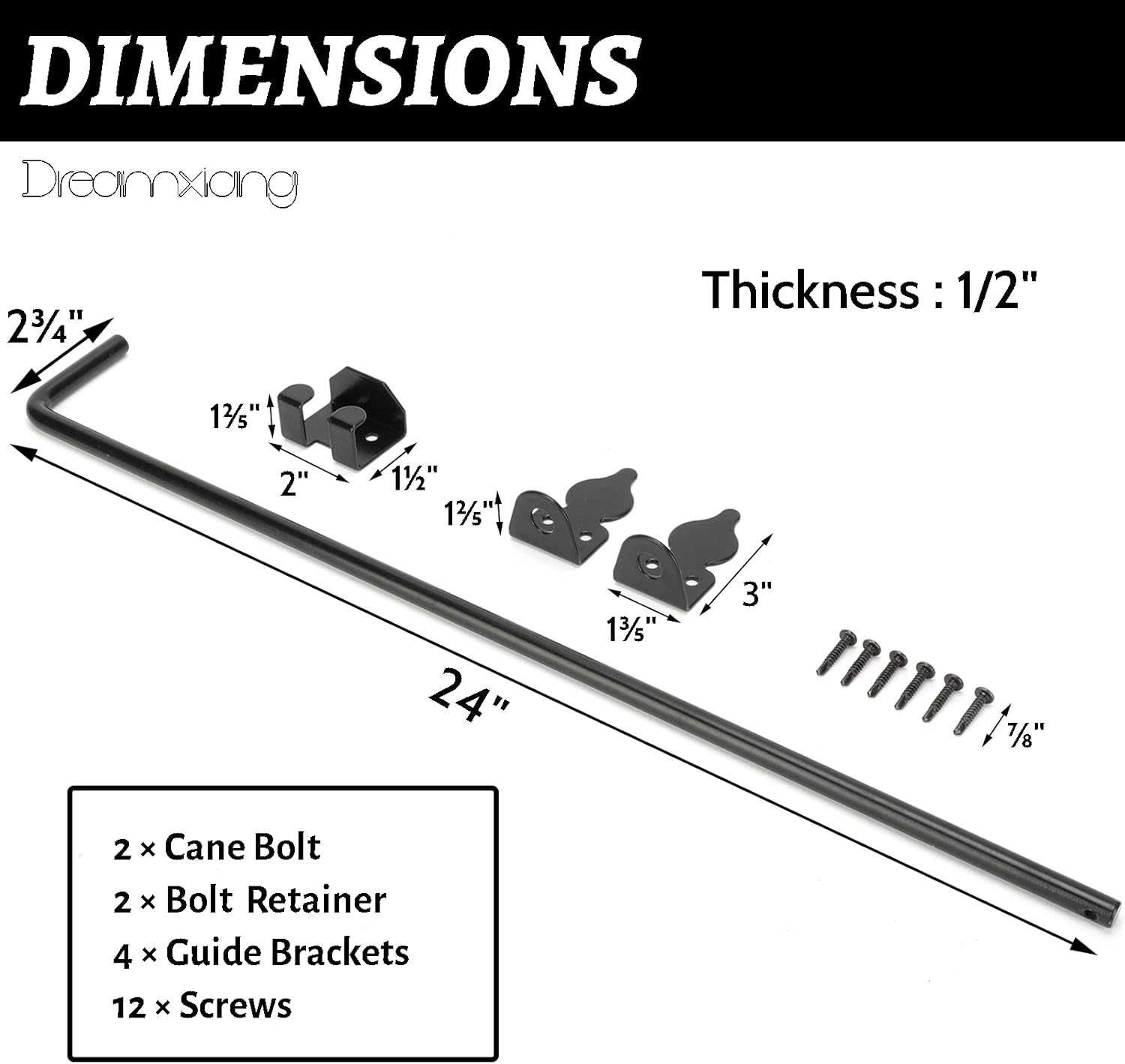 - 【EASY TO INSTALL】Dreamxiang heavy duty gate drop rod includes two sugarcane bolt, six fixed metal pieces, twelve screws. Measure the installation position, fix the accessories, punch the holes, and you can use it.