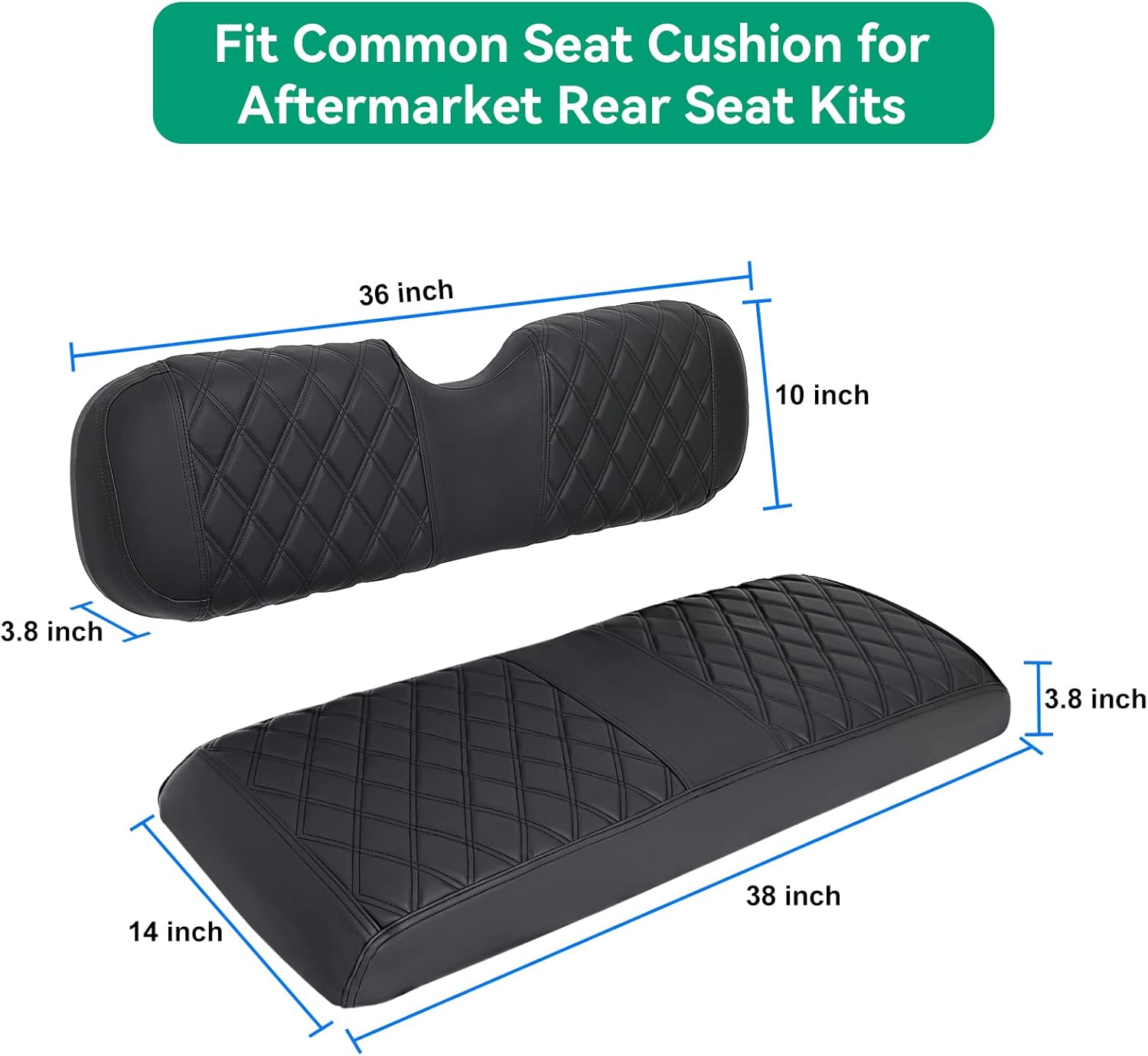 - 【Fit Models】Pvc leathur golf cart seat cover kit is only suitable to golf cart common rear seats for EZGO Yamaha,Clubcar and Icon carts, NOT for luxurious/speicial size thick cushions, please measure your seat size before buying.Seat cushion size: L38 x W14 x H3.8 inches, back rest size: L36 x W10 x H3.8 in.