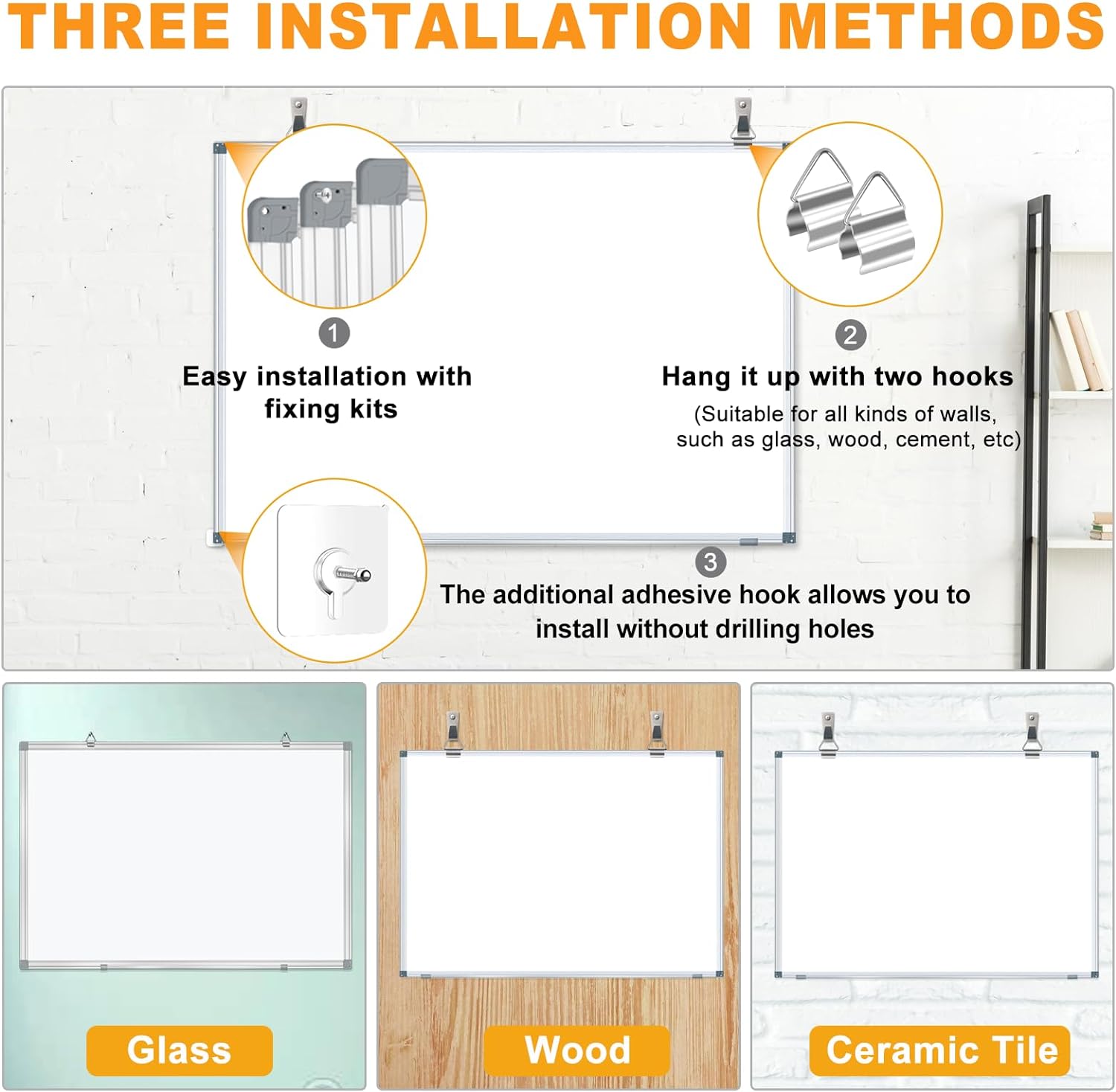 - THREE INSTALLATION WAYS: โ Drill holes in the wall, you can use the screws in the mounting kit to mount it; โ โ If it's not convenient to drill holes in the wall, White board comes with metal hooks both on the long and short side, so it can be hung horizontally and vertically as you like, the movable hanging hooks allow you to adjust hanging distance easily. โ โ โ Or you can hang it on the wall with our complimentary 4 Free Adhesive Hook.