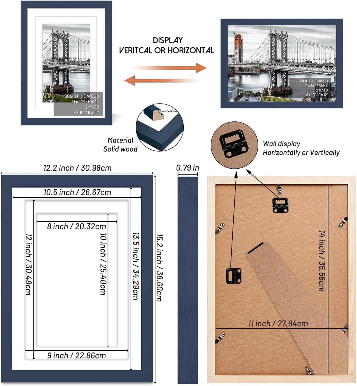 11x14 Picture Frames Solid Wood Display Pictures 9x12 or 8x10 with Mat or 11x14 Frame without Mat Poster Photo Frame Art with 2 Mats for Wall Mounting or Table Top(Jazz Blue)