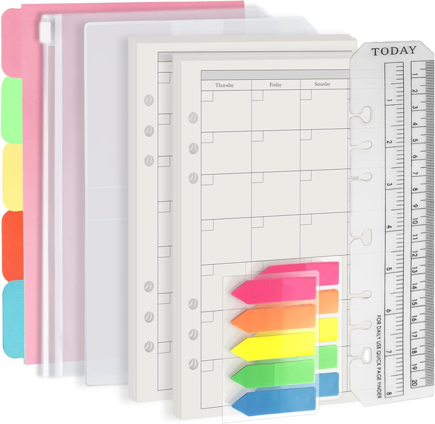 Harphia A5 6 Holes Binder Refill Value Set, 90sheets monthly plan loose leaf paper with stickers and dividers, planner insert with binder pockets for A5 binder 6 holes refillable notebook,005da5month