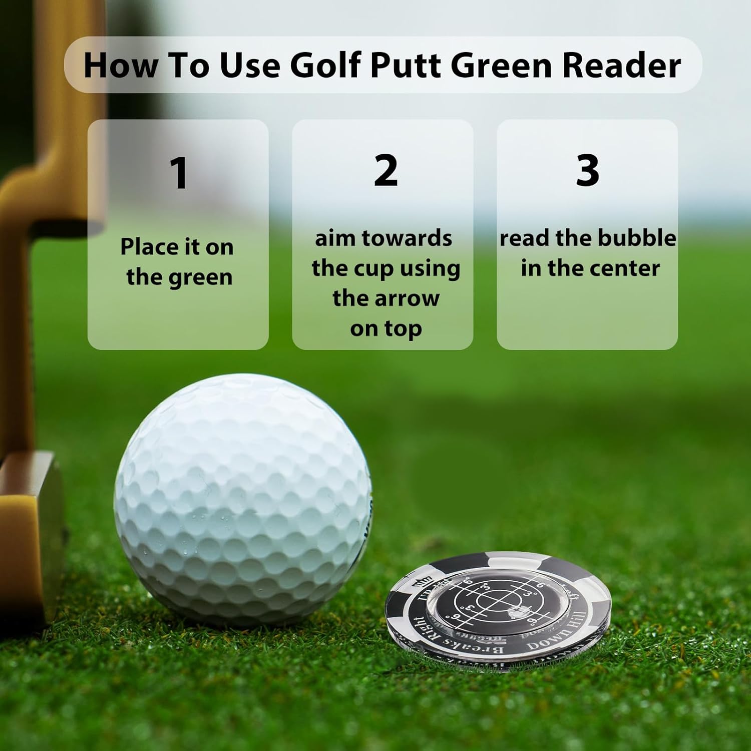 - Green reading process in 3 easy steps: 1.Place it on the green, 2.aim towards the cup using the arrow on top 3. read the bubble in the center. It not only visualizes slopes such as uphill, downhill, and breaks but also provides precise angle measurements. Within a 5 ft putt, measuring behind the ball yields optimal results, while multiple points are recommended for longer putts.