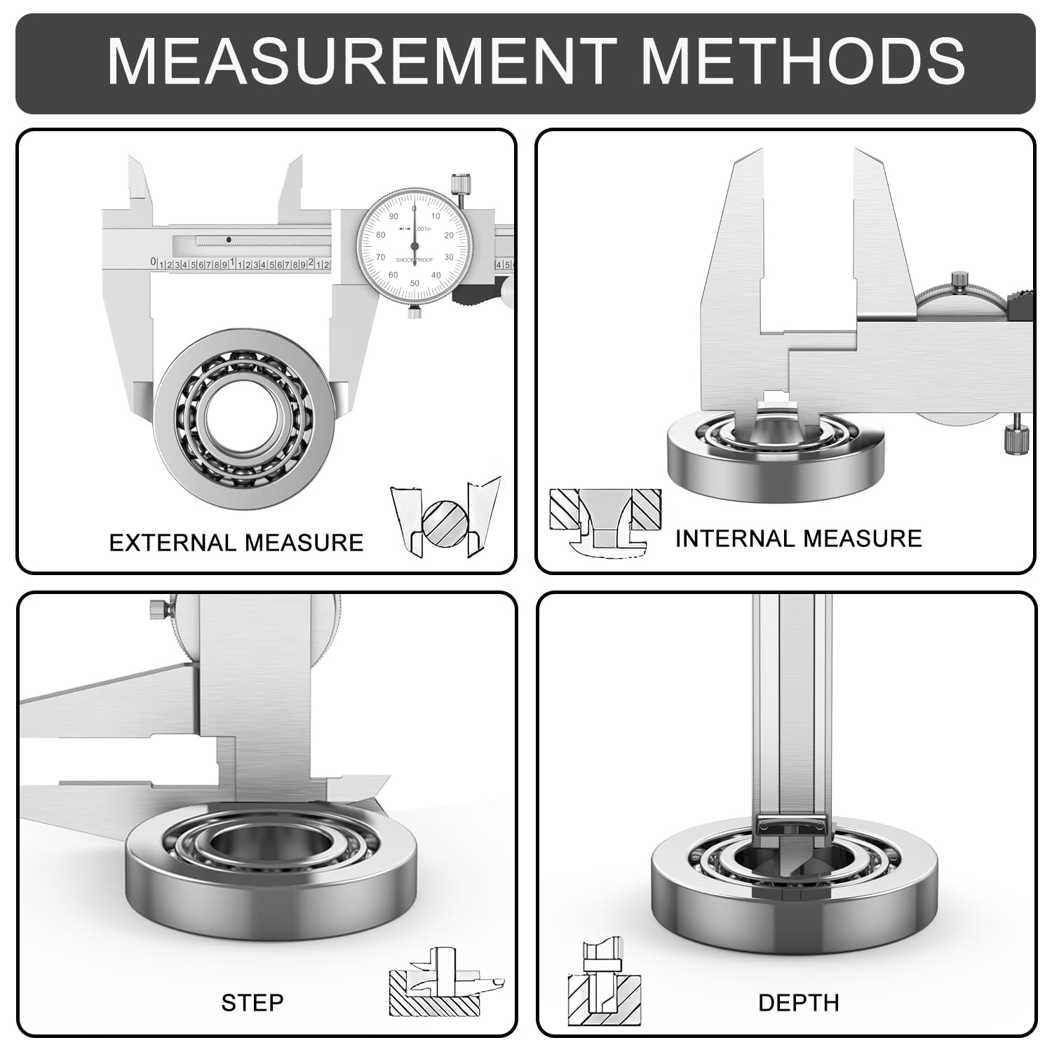 - 4-way measurement: Dial calipers provide accurate measurement of external dimensions, internal dimensions, depth and steps for metalworking.