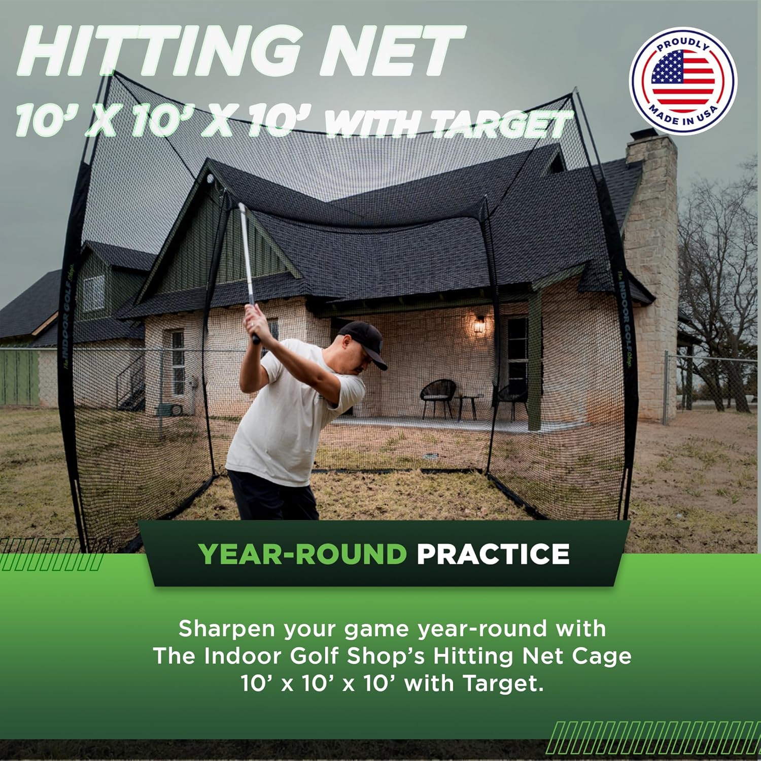 - Outdoor and Indoor Golf Net Cage with Target: The Indoor Golf Shop’s 10’ x 10’ x 10' golf cage includes a swing target so your game noticeably improves. You can sharpen your game year-round with this indoor and outdoor golf equipment. Set it up inside during the offseason so your swing is ready the next time you’re on the course. Use it as an outdoor golf net to hit balls in your backyard if you don't feel like going to the range or want to warm up before a round.