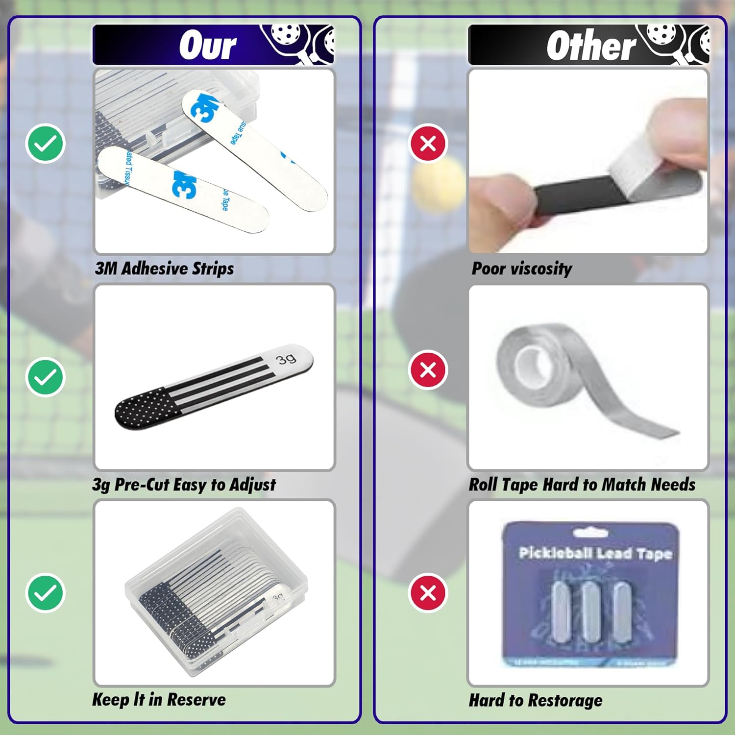 - 【Premium Lead Tape】 You will receive a box containing 20 pieces of lead tape for pickleball. Each piece weighs 3g/0.1oz. Our advanced adhesive technology ensures that the lead tape securely attaches to any position on the paddle, providing maximum stability even during intense competitions.