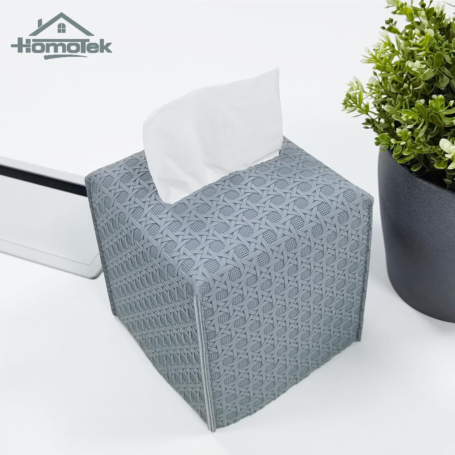 HOMOTEK 2 Pack Tissue Box Cover, Square PU Leather Tissue Holder, Decorative Facial Tissue Cube Paper Organizer Dispenser for Bathroom, Night Stands, Desk, Car 5X5X5'' - Rattan Weave, Light Gray