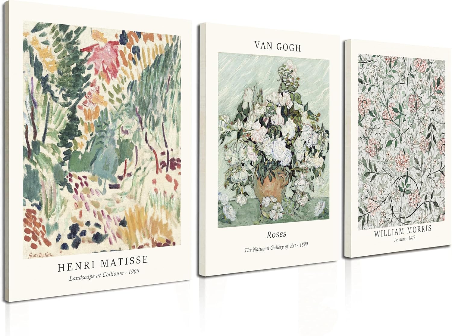 Induslyfe Framed Sage Green Vintage Wall Art Canvas Decor Set of 3, Matisse Wall Art Prints Posters Mid Century Modern Art, Aesthetic Floral Botanical wall art for bedroom, living room, bathroom 12x16