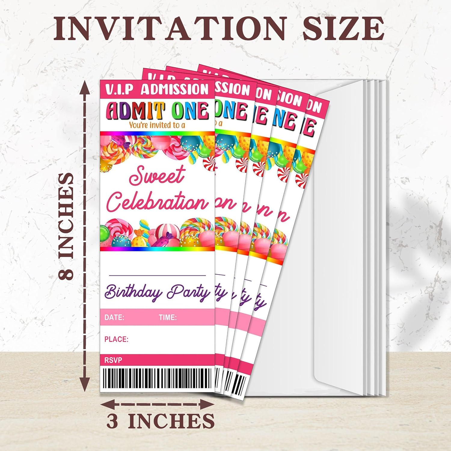 20 Candy Party Ticket Invite Cards-Sweet Celebration Birthday Invitation with Envelopes for Kids Girls Boys-Pink Candy Birthday Cards-Party Favor & Supplies (3×8 inch)-A26