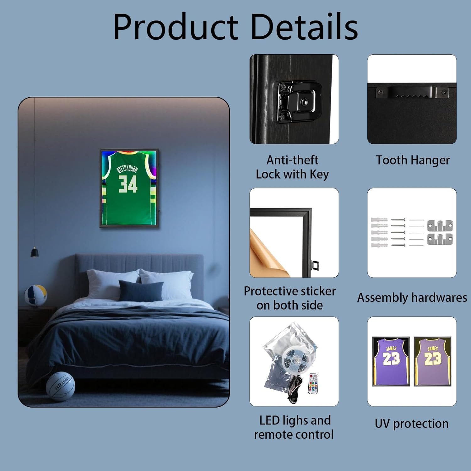 - [JERSEY FRAME WITH LED]- IHEIPYE LED Jersey Frame Display Case is made of high quality wood and comes with attachable LED light strips to add sparkle to your jerseys. You can use the remote control to select the colour of the light and the way it flashes to add a better display to your collection. The jersey frame with LED strips is durable and safe to the touch and won't damage your treasures, while still creating a glamorous and attractive look.