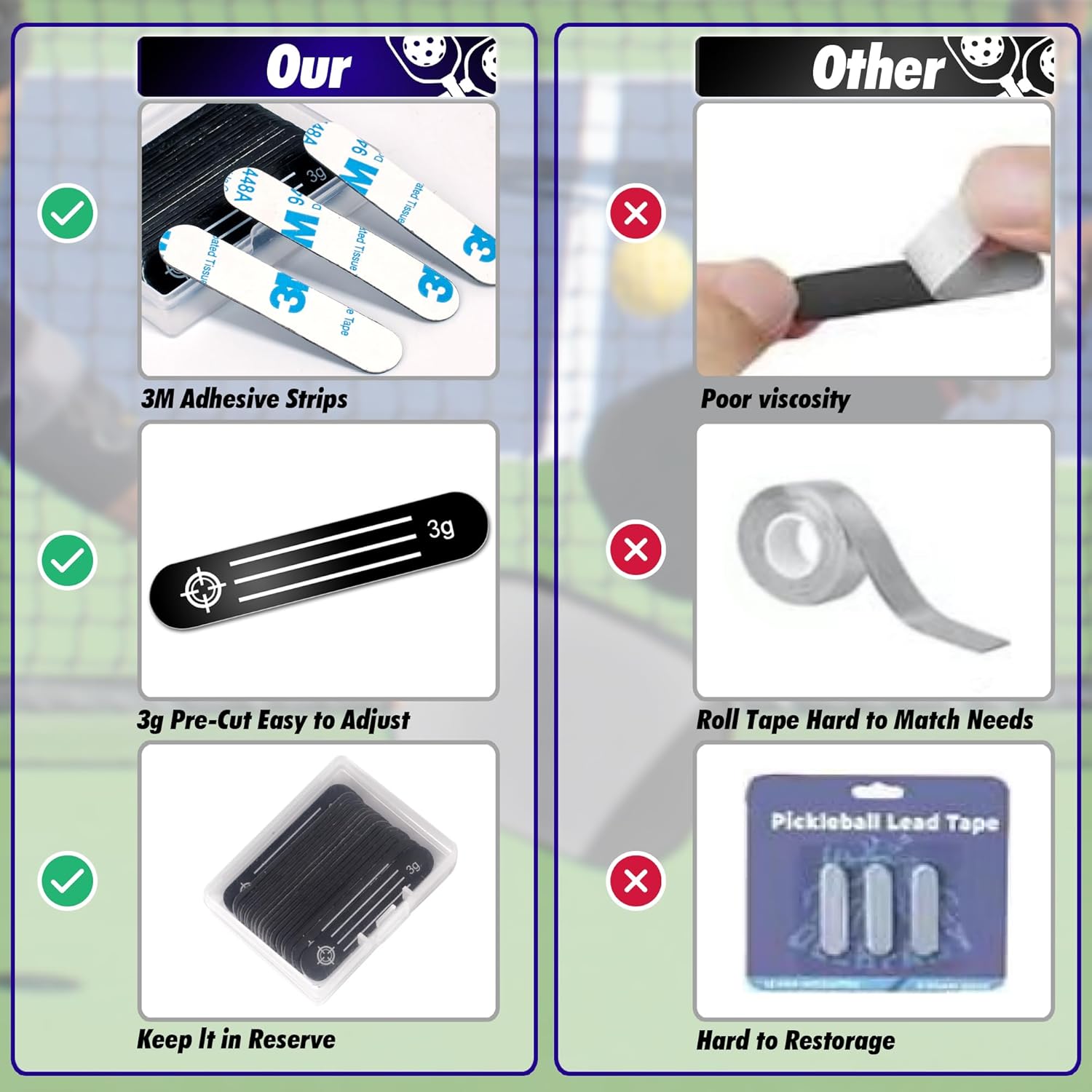 - 【Premium Lead Tape】 You will receive a box containing 20 pieces of lead tape for pickleball. Each piece weighs 3g/0.1oz. Our advanced adhesive technology ensures that the lead tape securely attaches to any position on the paddle, providing maximum stability even during intense competitions.
