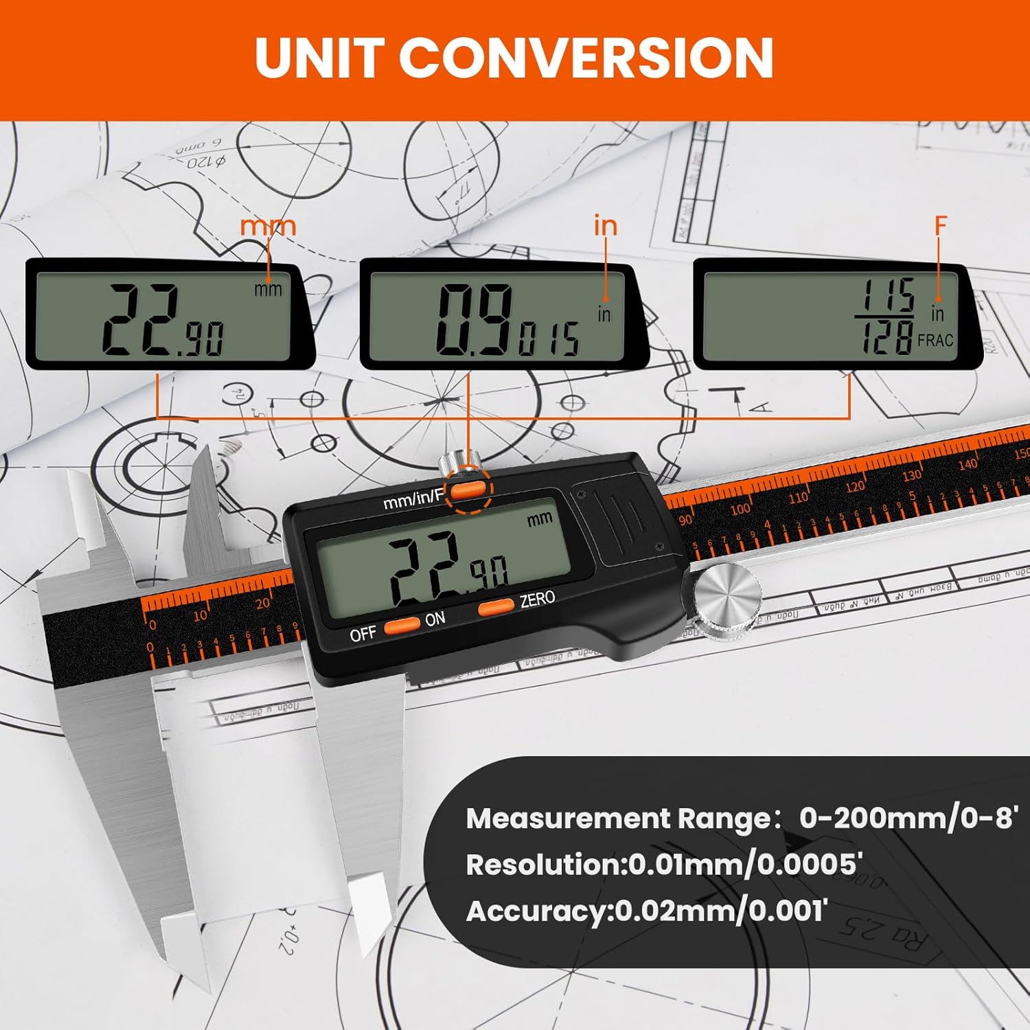- [3 TYPES OF UNIT CONVERSION]-User can switch 3 units with the calipers measuring tool: inch, fractions, and millimeters. No additional tools required, significantly saving you time. Press the on/off button and slide the digital caliper to any position to read the value on the screen