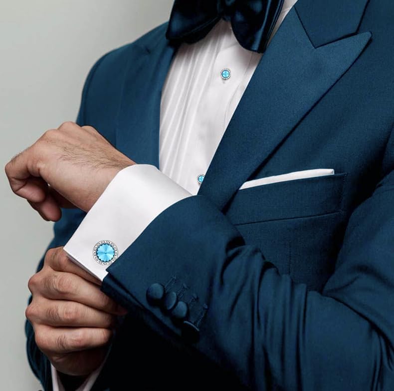 - 【Birthstone Cufflinks and Studs for Men】The March cufflinks and tuxedo studs set convey calm and courage as a gift for your husband, brother, boyfriend, other male friends, or yourself. Aquamarine set express your care for him as energy color.