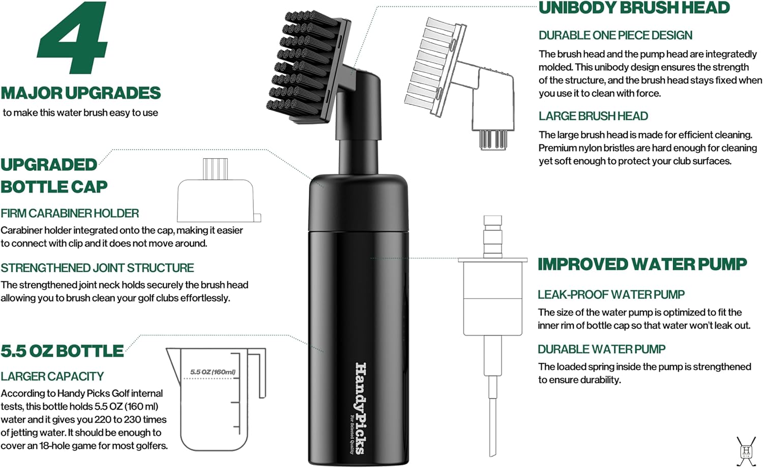 - The New Golf Water Brush: the inner structure of the brush head had been re-designed and reinforced so that you can effectively clean your golf items while the brush head stays fixed. The improved pump system prevents leakage and only gives you jetting water when you need it. The premium nylon bristles are hard enough for cleaning yet soft enough to protect your club surfaces.