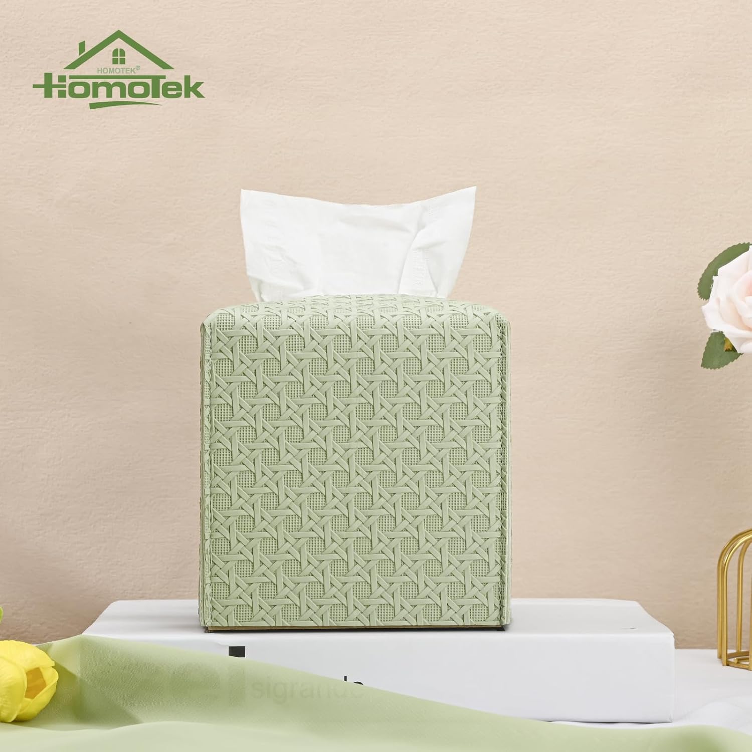 HOMOTEK 2 Pack Tissue Box Cover, Square PU Leather Tissue Holder, Decorative Facial Tissue Cube Paper Organizer Dispenser for Bathroom, Night Stands, Desk, Car 5X5X5'' - Rattan Weave,Mint Green