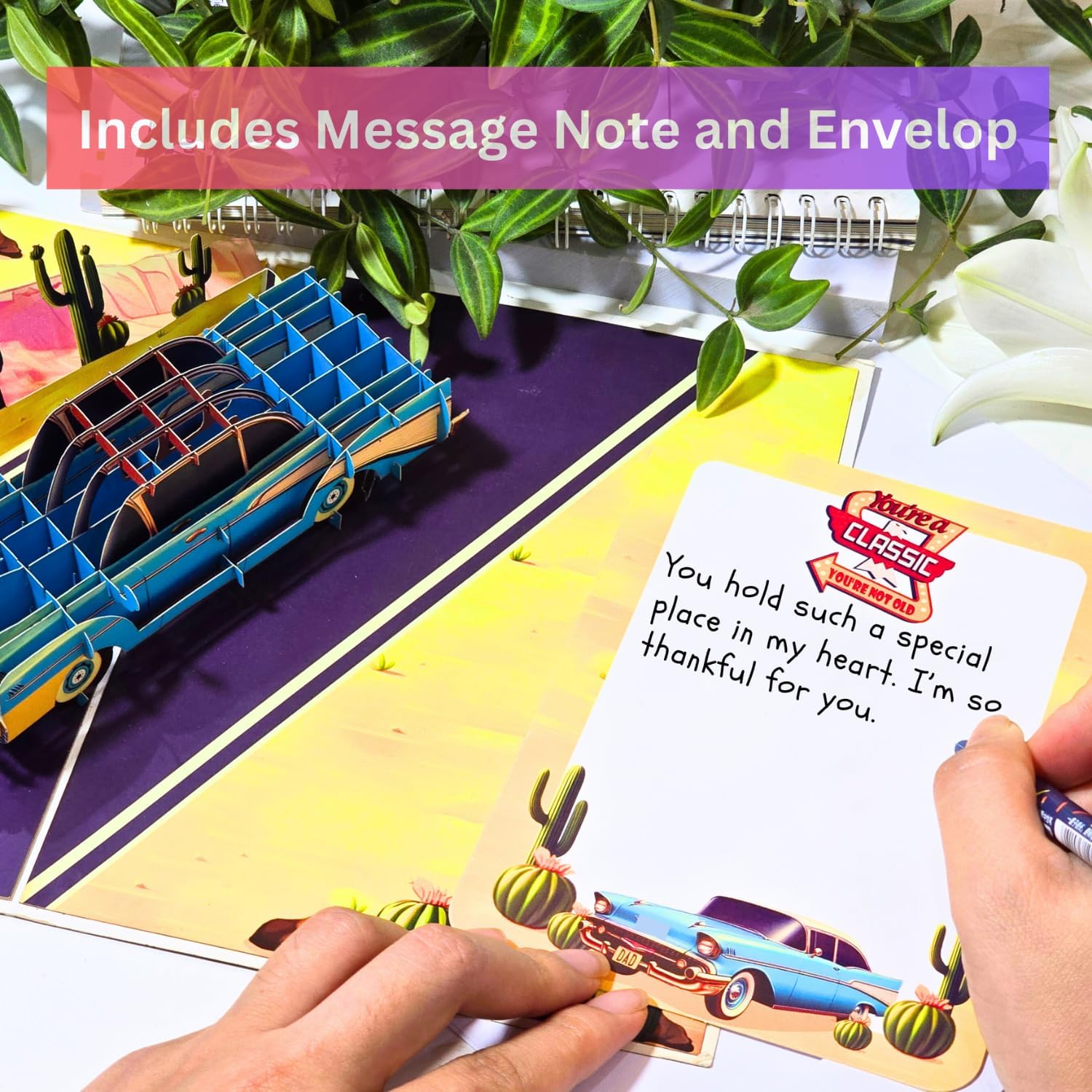 HEARTAGS- Pop Up Birthday Card for Men, Classic Car Birthday Card For Dad, Husband, Brother, Son, Grandpa, 3D Popup Greeting Cards Size 6x8 inches Includes Message Note and Envelop