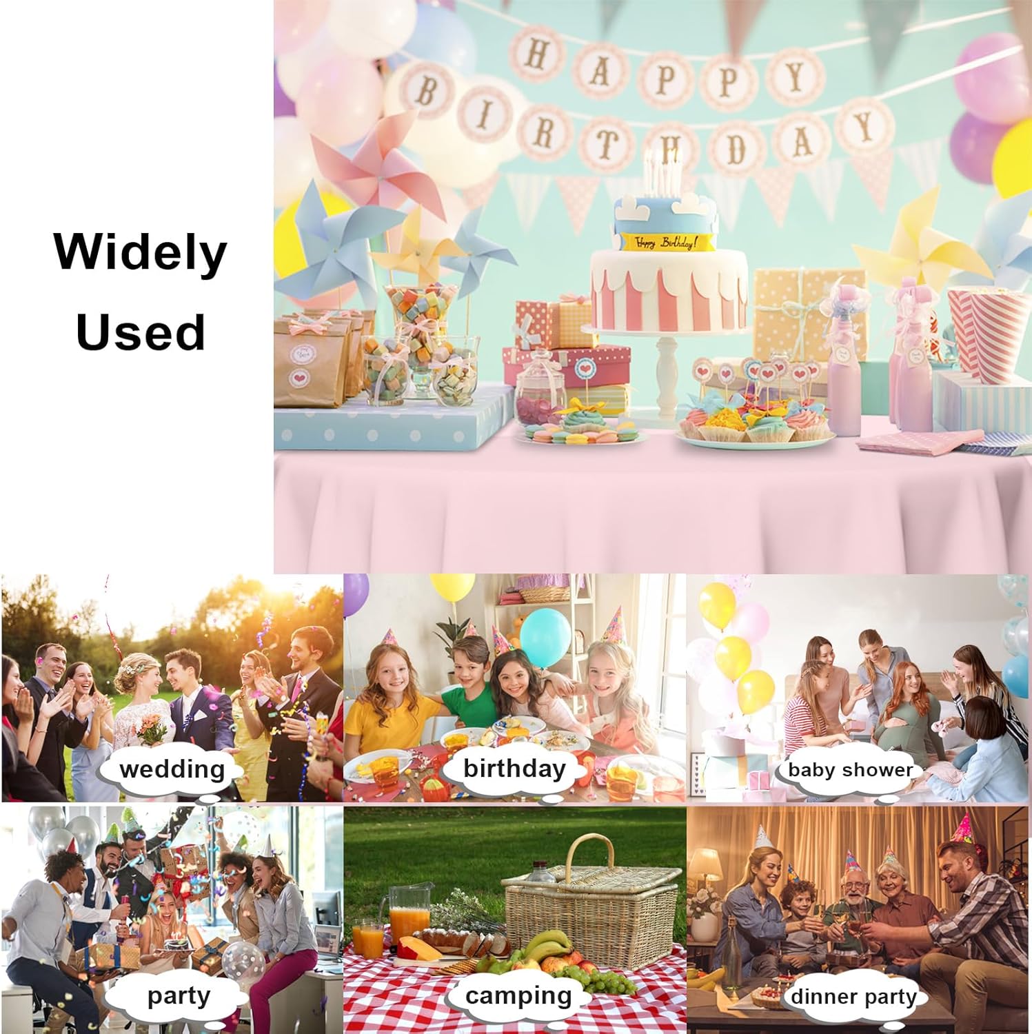 - 【Durable Plastic Tablecloths】Our round disposable pink tablecloths are made of premium durable PE material, creating a waterproof barrier that keeps your table fully protected at all times. The disposable pink tablecloth measures 84 x 84 inches, covers an 8-foot table, and can be cut to size. Our package includes a 12-pack of pink plastic tablecloths, and you'll have enough covers for even big events or multiple occasions