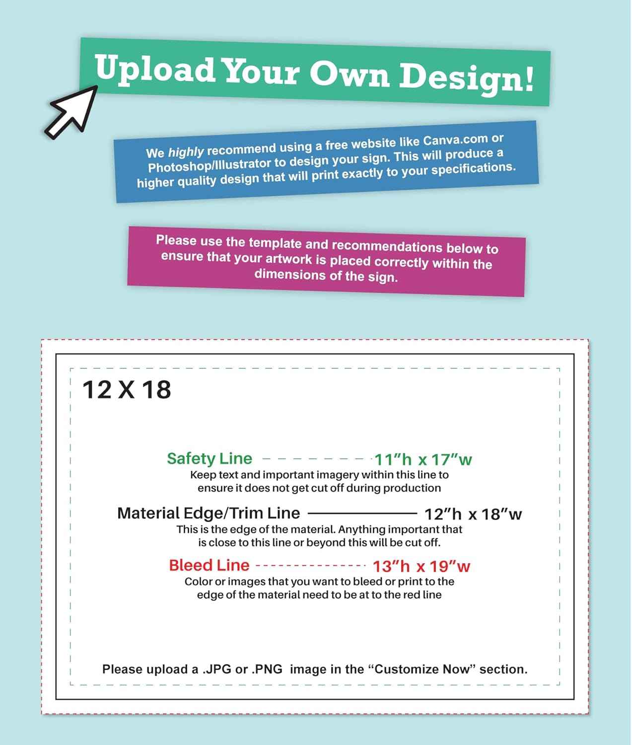 - IMPORTANT: Signs can only be printed in landscape (horizontal) orientation. Orders received with artwork rotated to print in vertical orientation will be canceled as these will not be compatible with the included wire stakes.