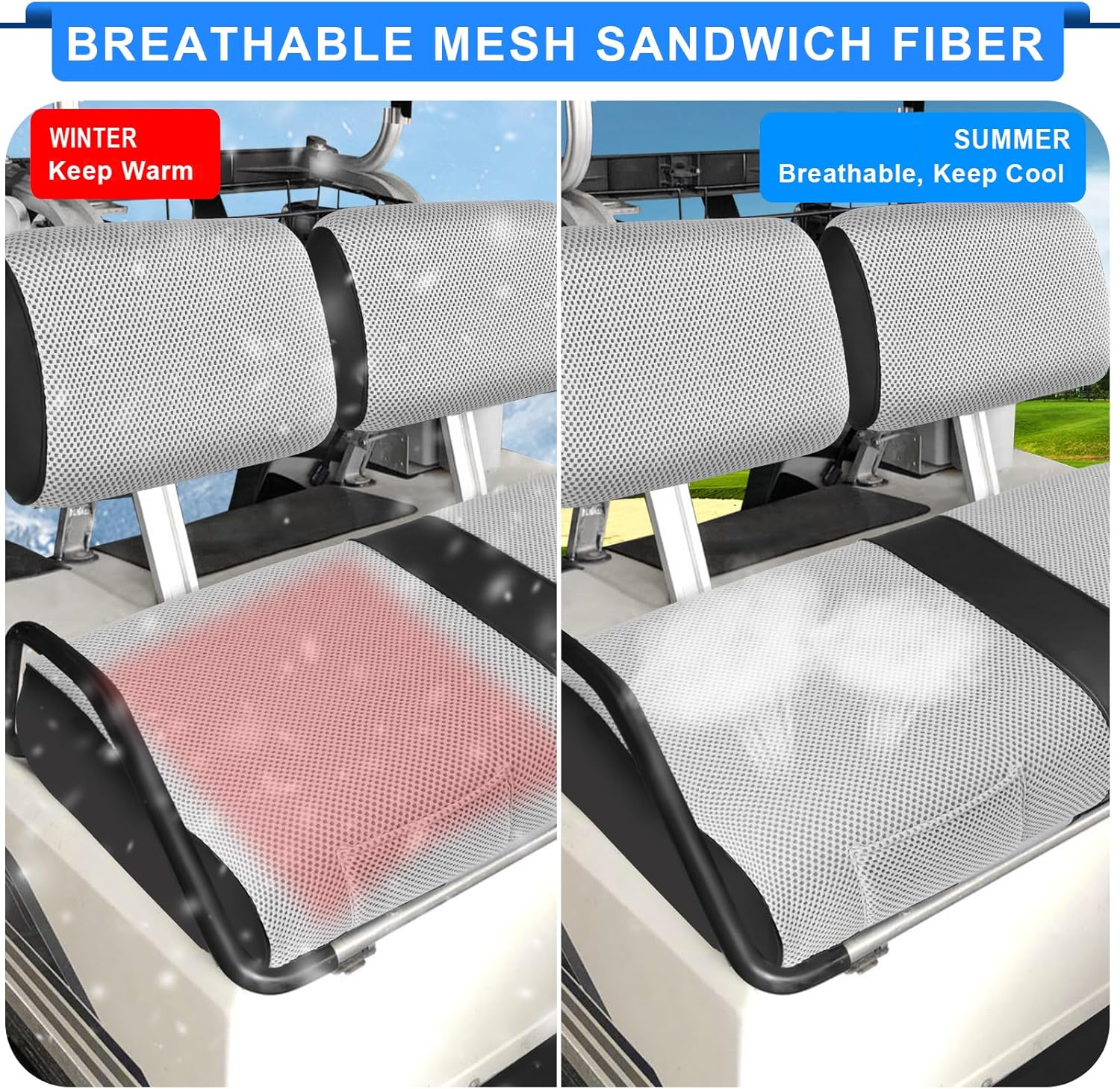 - Suitable for All Seasons: The fabric addition makes the entire club car ds seat cover more breathable. With breathable fabric and partial leather in a new sandwich-style design, this seat cover stays breathable in summer and provides warmth in winter. This front seat cover is perfect for year-round use, regardless of the season