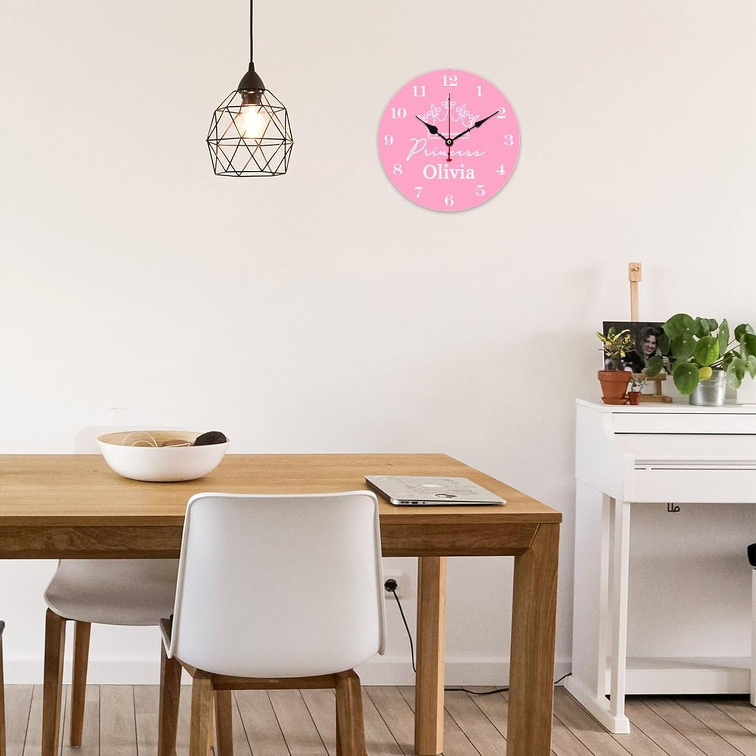 12 inch Pink Crown Personalized Girls Name Wall Clocks Battery Operated for Kids Bedrooms Nursery School Playroom Decor,Custom Kids Name Wall Clock,Girls Room Decor Wood Round Clock Silent