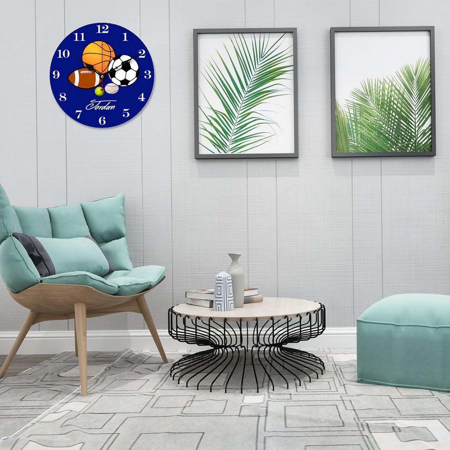 10 inch Blue Sports Ball Personalized Kids Name Wall Clocks Battery Operated for Kids Bedrooms Nursery School Playroom Decor,Custom Kids Name Wall Clock,Sports Decor Wood Round Clock Silent