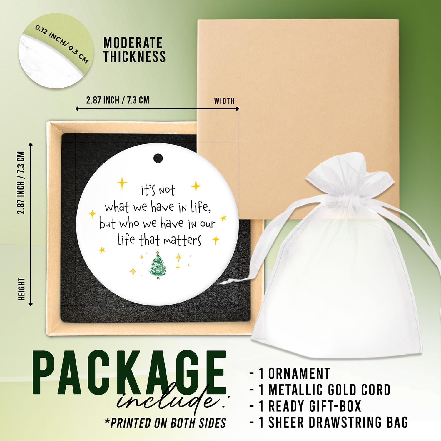 - THOUGHTFUL PACKAGE: Our Ornament comes complete with 1 Two-Sided Ornament, 1 Gift Box, and hanging cords. The two-sided design and attached hanging cords make it a breeze to hang anywhere from any angle, be it on trees or your home. Rest assured, the gift box ensures the ornament remains well-protected during transit, avoiding any damage