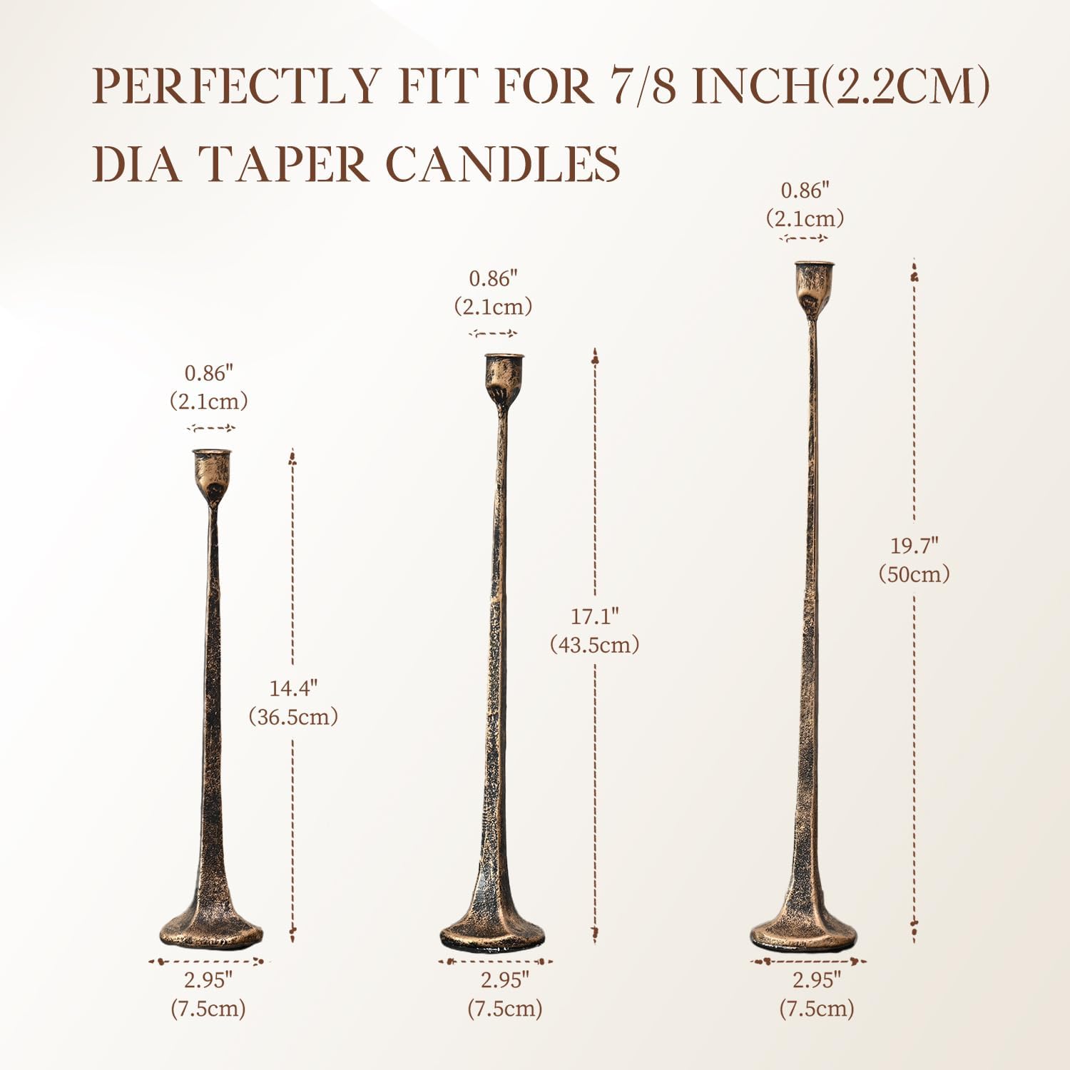 - Tall Antique gold cast iron taper candle holders . Candle holder only, Candles not included. Taller size than others'.Size - S:3.0×14.4 inch(7.5 x 36.5 cm), M:3.0 ×17.1 inch (7.5 x 43.5 cm), L:3.0 ×19.7 inch(7.5 x 50.0cm ). The inner diameter of the cup of the taper candle holders is 0.87 inches (2.2 cm), which is suitable for 3/4 inch, 7/8 inch candles and LED cone candles. taper candles.