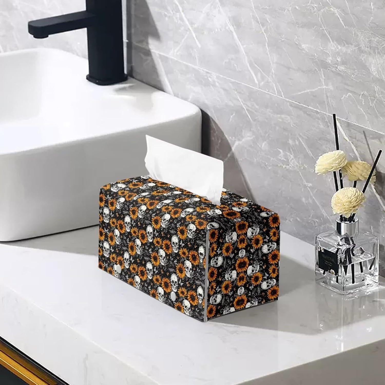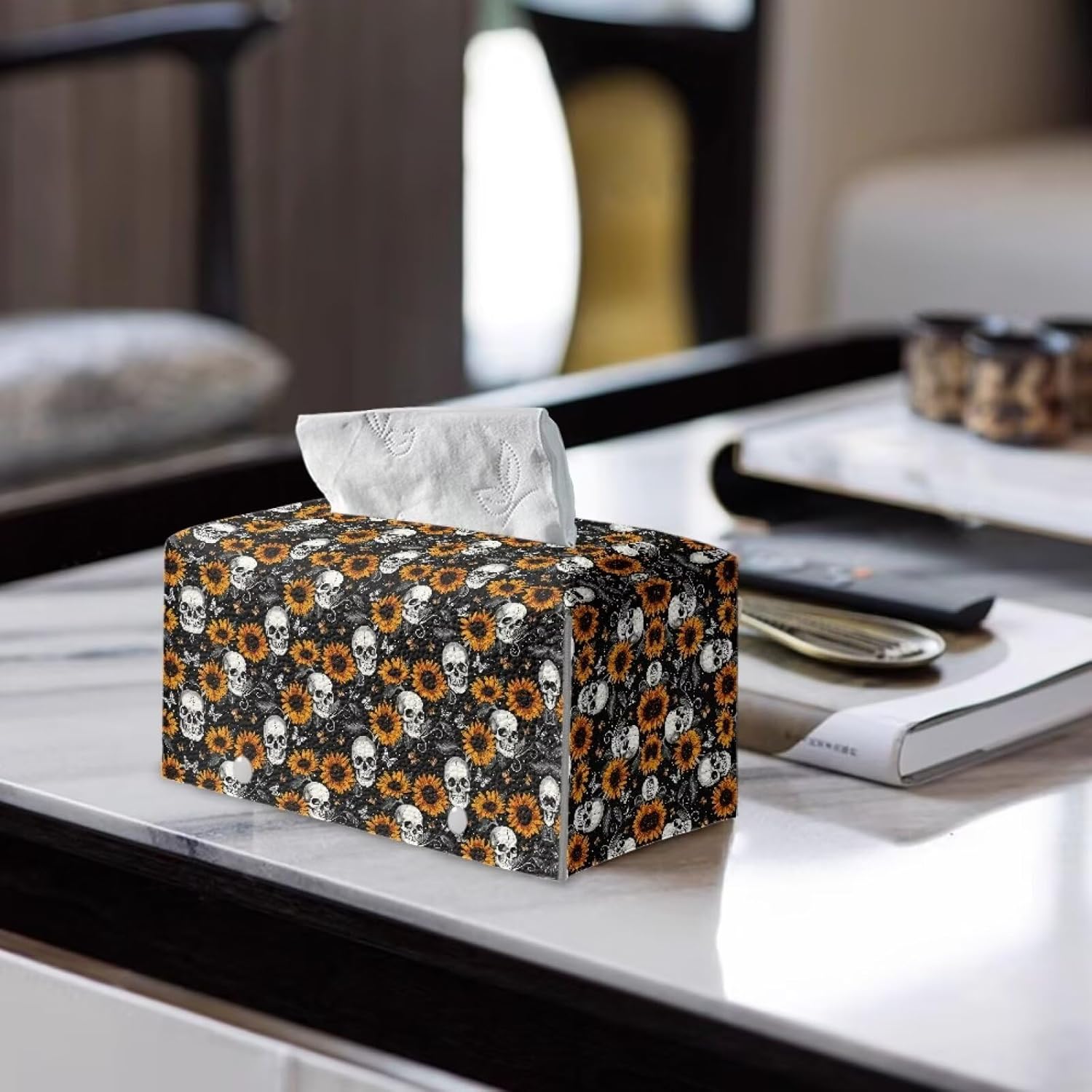 Halloween Tissue Box Cover with Skull Sunflower Print Waterproof Portable for Travel Designed with Modern PU Leather Folding Indoor Decorations 9.7"x5.2"x5.12" Easy to Clean