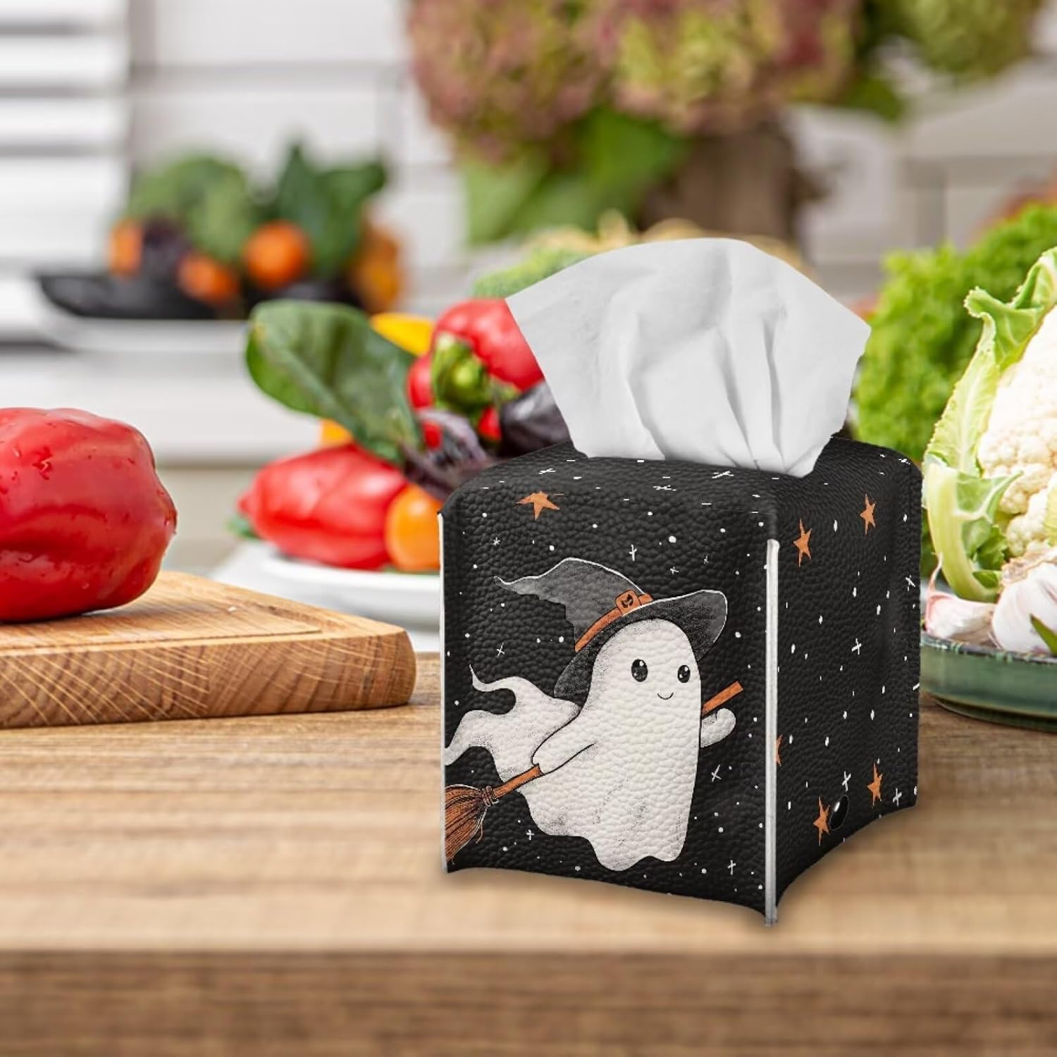 Halloween Black Cute Ghost Tissue Holder Faux Leather Square Tissue Box Covers Soft Folding Easy to Clean Decorative Bathroom Accessory Tissue Box Organizer for Table, Desk, or Countertop