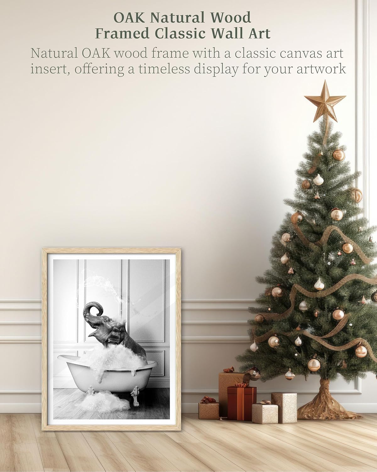 iHery Natural OAK Wood Framed Wall Art, 12x16 in Funny Bathroom Wall Art Decor, Elephant Bathing Animals Canvas Prints, Black and White Wall Decor Pictures For Bedroom Living Room Set of 1