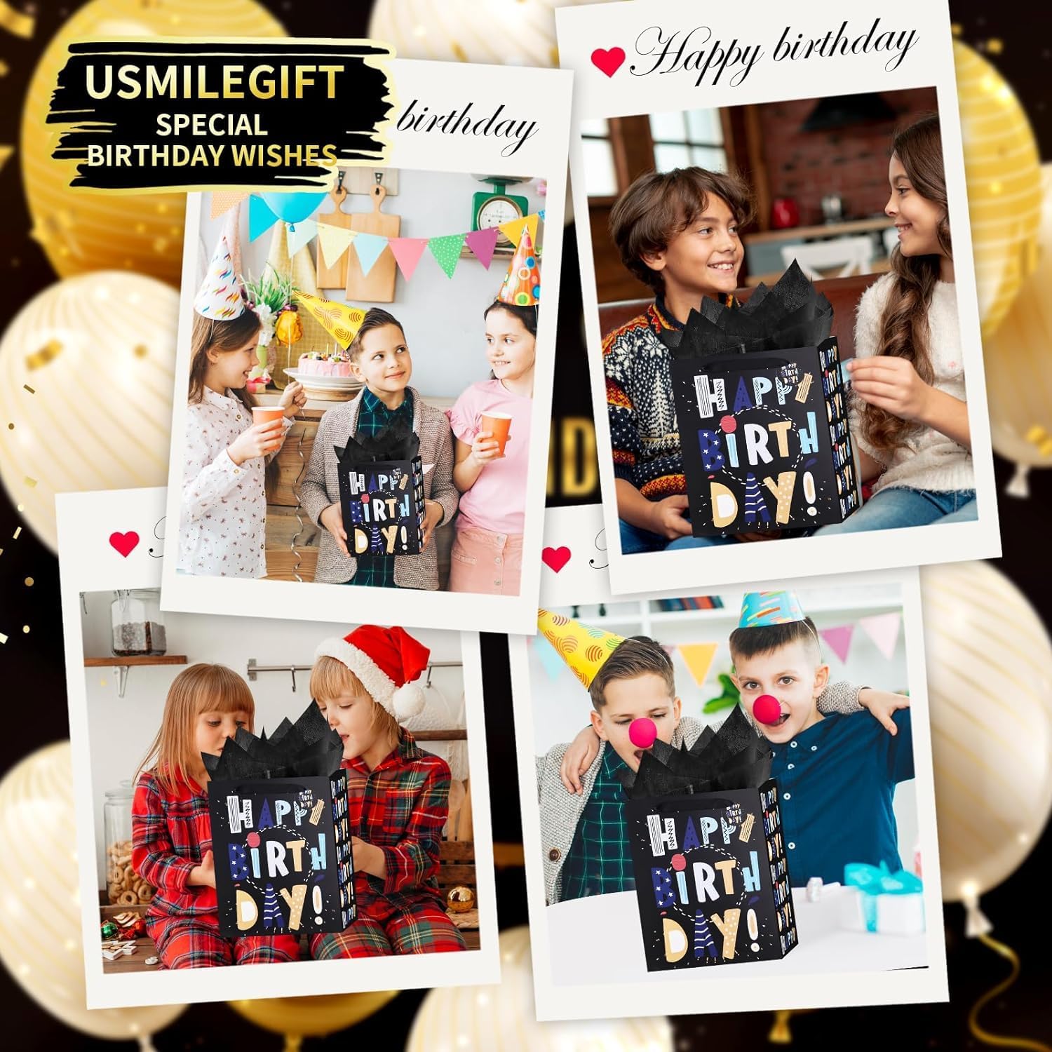 13" Black Happy Birthday Bags for Kids with Tissue Paper and Greeting Card for Party,Happy Birthday Gift Bag for Kids, Boys, Girls, Baby Boy,Men Women,Gift Bags Medium size (1 Pcs Black, Kids Gift Bag)