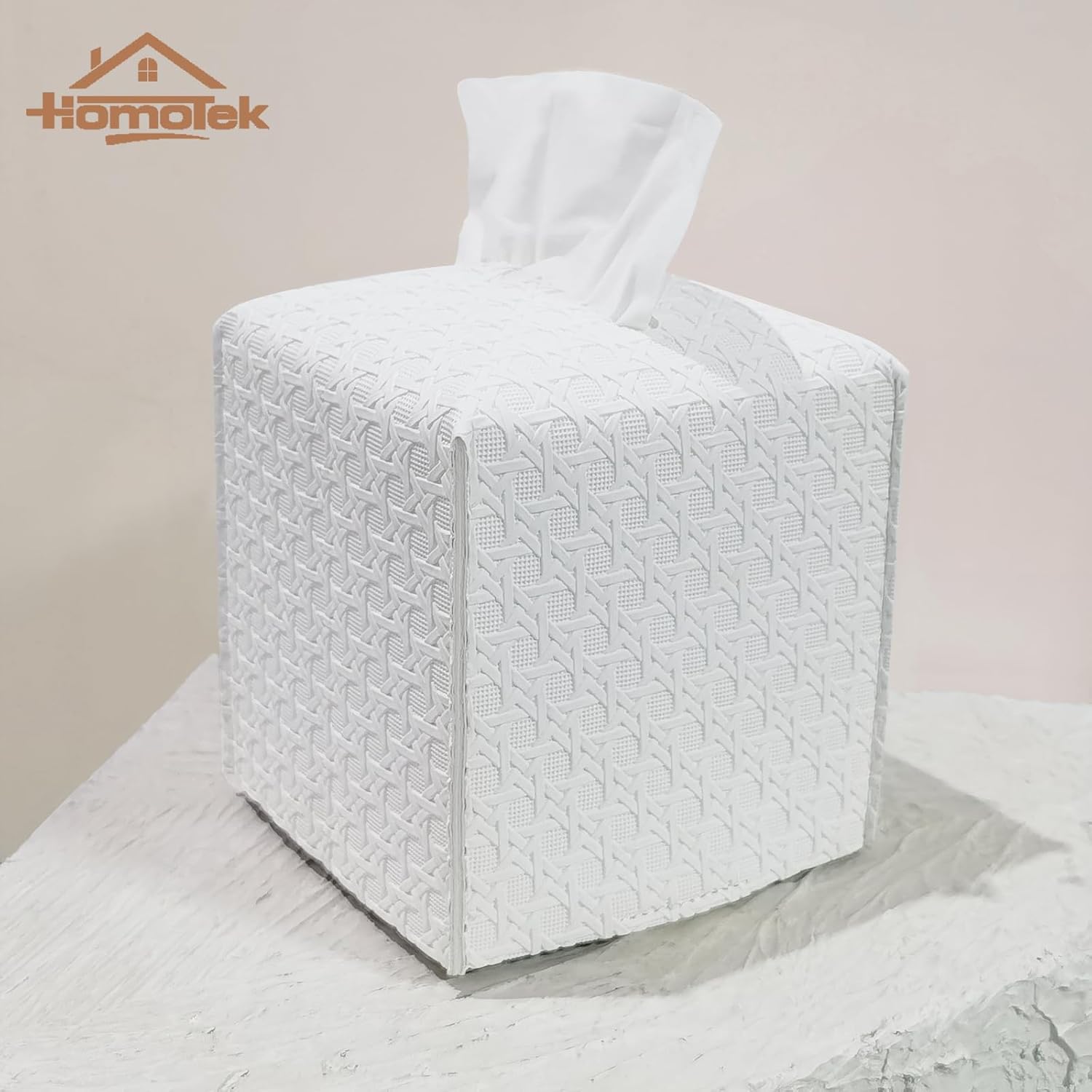 HOMOTEK 2 Pack Tissue Box Cover,PU Leather Tissue Holder,Square Decorative Facial Tissue Cube Paper Organizer Dispenser for Bathroom, Night Stands, Desk, Car 5X5X5'' - Rattan Weave, Pure White