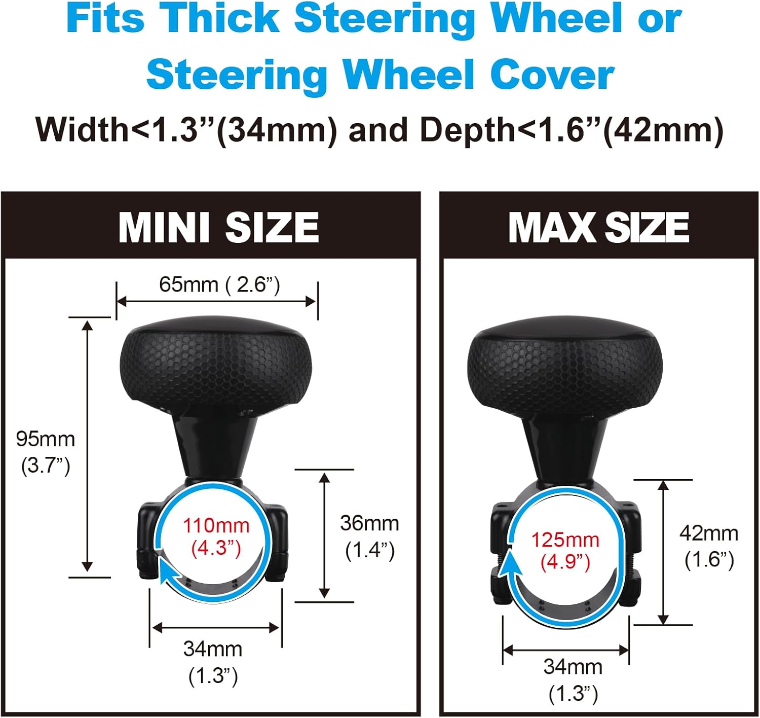 - ✅【Large Knob】Black steering wheel knob L with bigger mount than other knobs, it fits most vehicles; Fits steering wheel Diameter 1.3" - 1.6"; Please use the supplied rubber pad to protect the steering wheel and adjust the size. (Tip: the rubber pad can be cut and used)