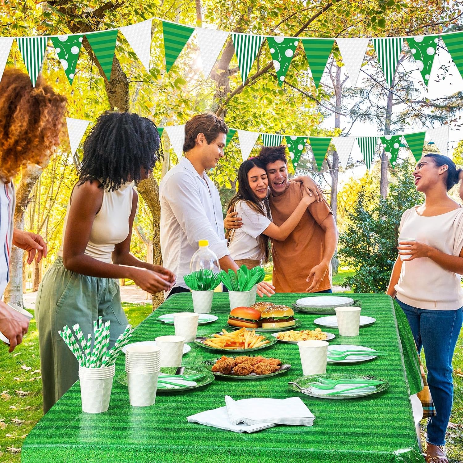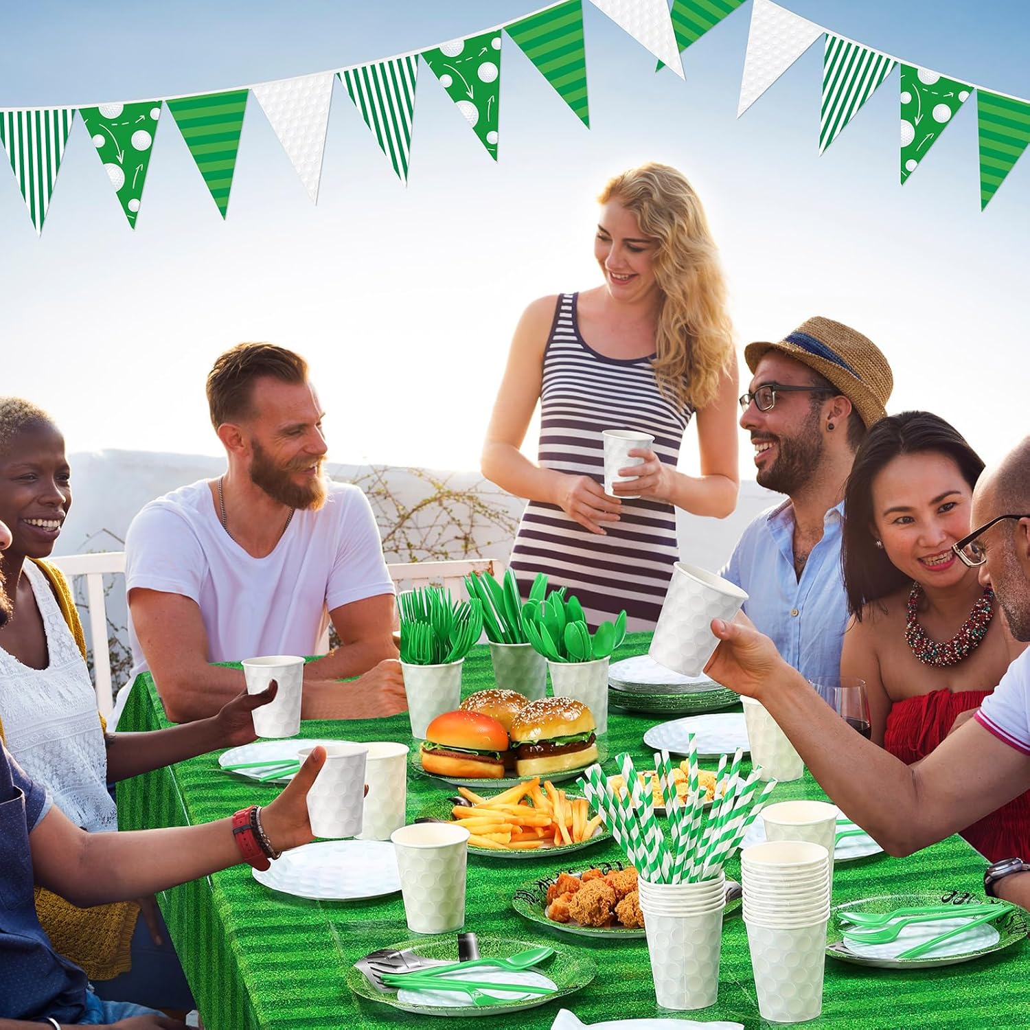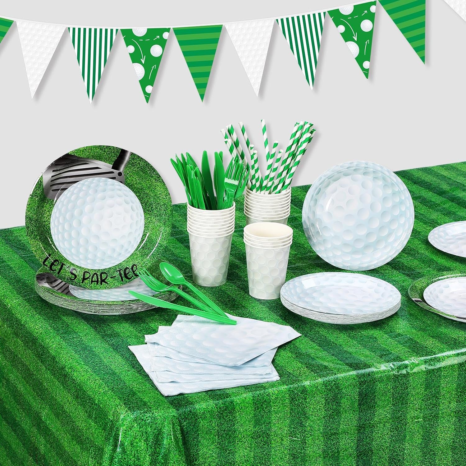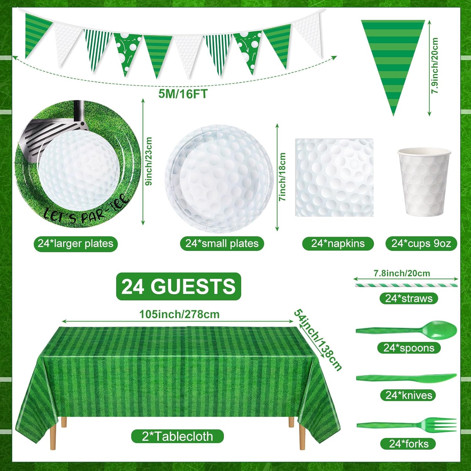 - Comprehensive Golf Party Package: the set boasts 195 pieces, including 24 pieces of 9 inch dinner plates, 24 pieces of 7 inch dessert plates, 24 pieces of 9 oz paper cups, 24 pieces of forks, 24 pieces of spoons, 24 pieces of knives, 24 pieces of straws, 24 pieces of paper napkins, 2 pieces of plastic tablecloths, 1 pieces of 16.4 feet golf pennant banner, you will have an adequate amount of supplies to cater to your golf-themed party, bring excitement and vibrancy to your celebration