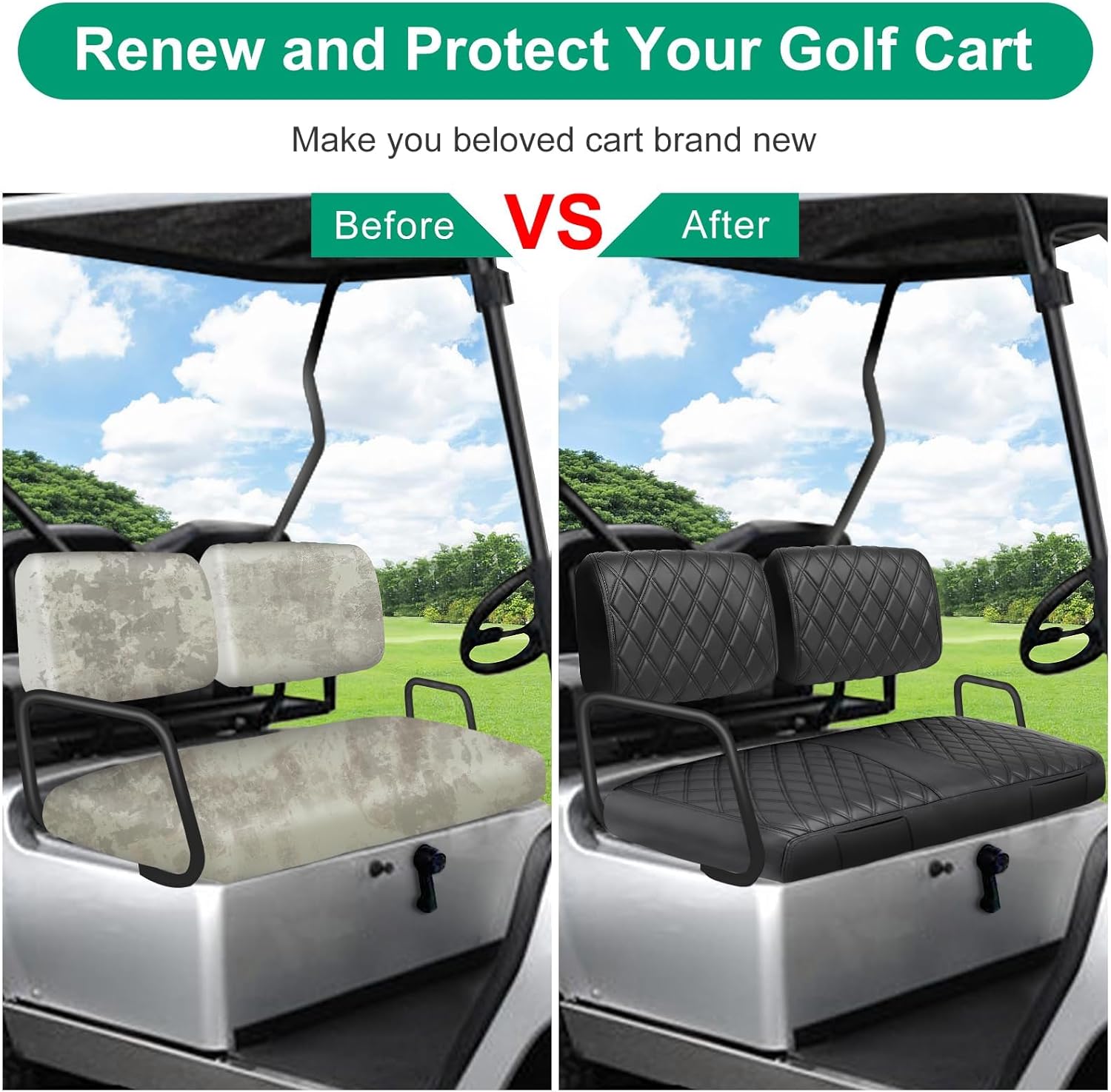 - Upgraded Version: Smooth vinyl PVC leather material and black color make it easy to clean and dirty resistance. Diamond Diamond stripes makes your golf cart brand new and fashion. Quality elastic rope and adjustable buckels help the seat covers tighten with the cushions, very stable. Small pocket for storing keys, cards, Phone etc.
