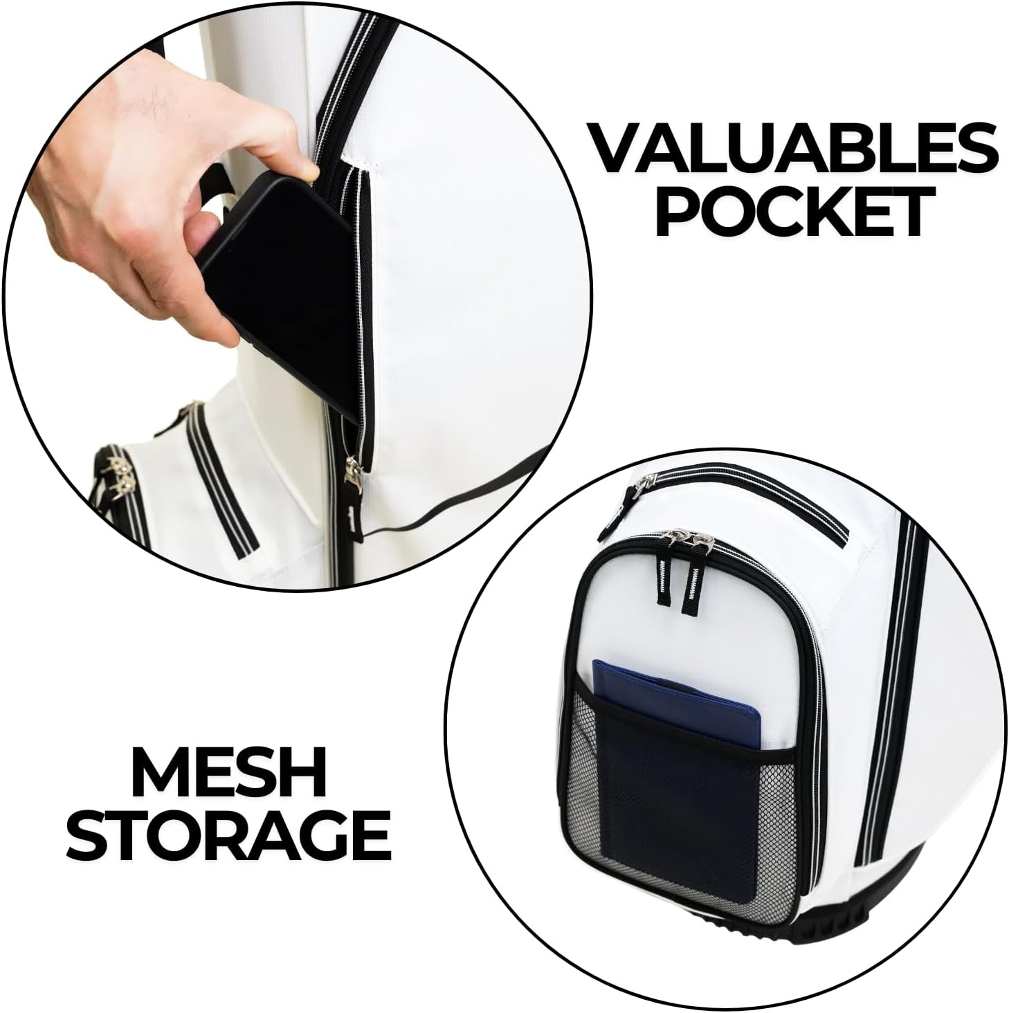 - Premium Features: Our cart golf bag includes 6 total pockets, including a valuables pocket, single carry strap, umbrella holder, glove holder, towel clip, and rain hood