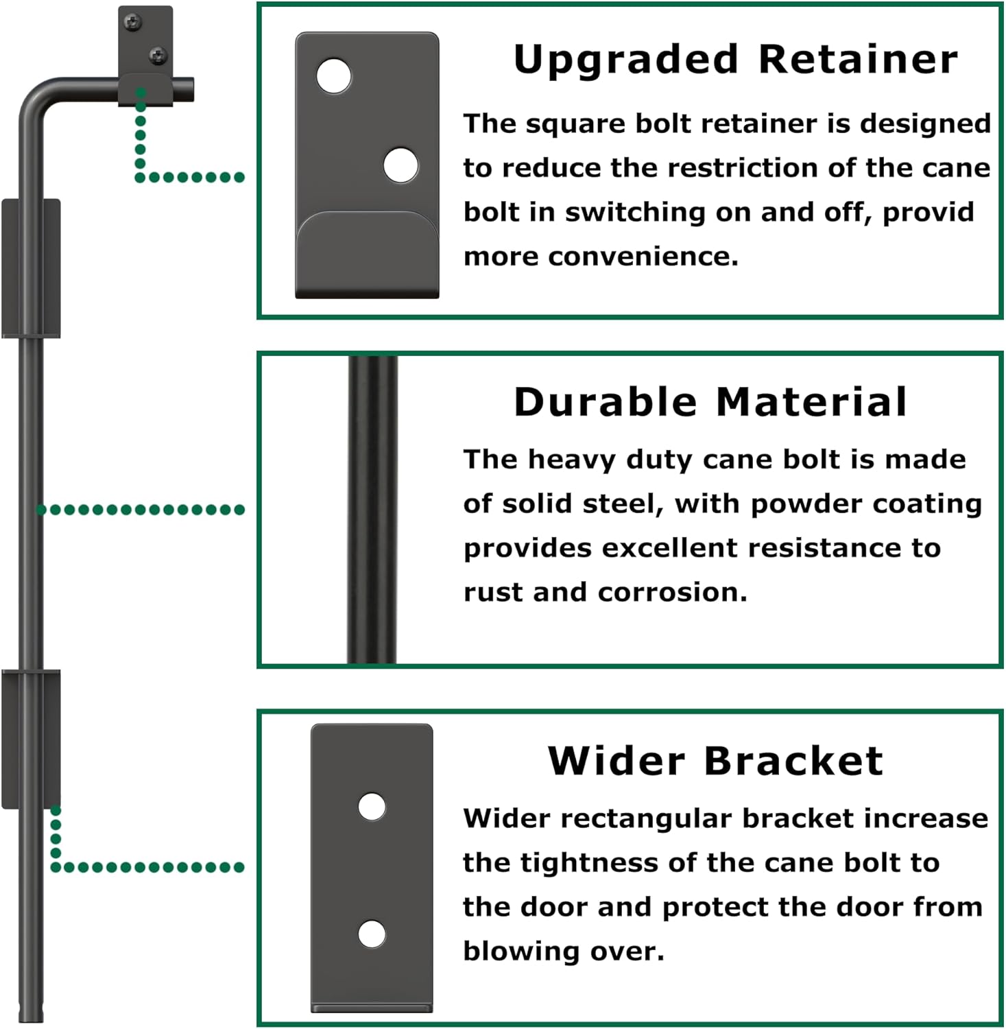 - 👑【Long-lasting Durability】The cane bolt is made of heavy duty solid steel, hard and resistant to deformation. With black powder coating, make the gate drop rod have excellent corrosion and rust resistance. Strong and durable for rough condition, last long life in outdoor and indoor gate.