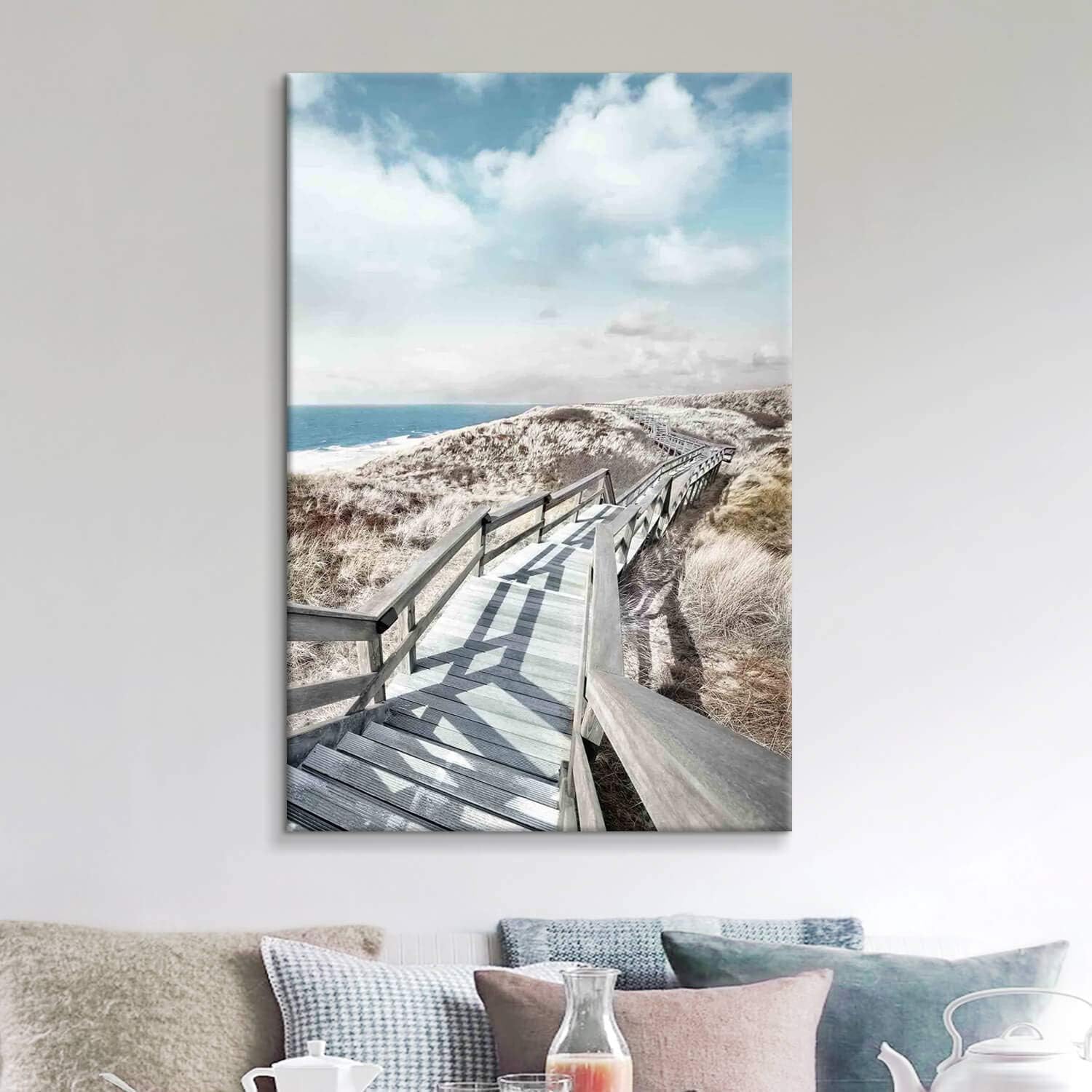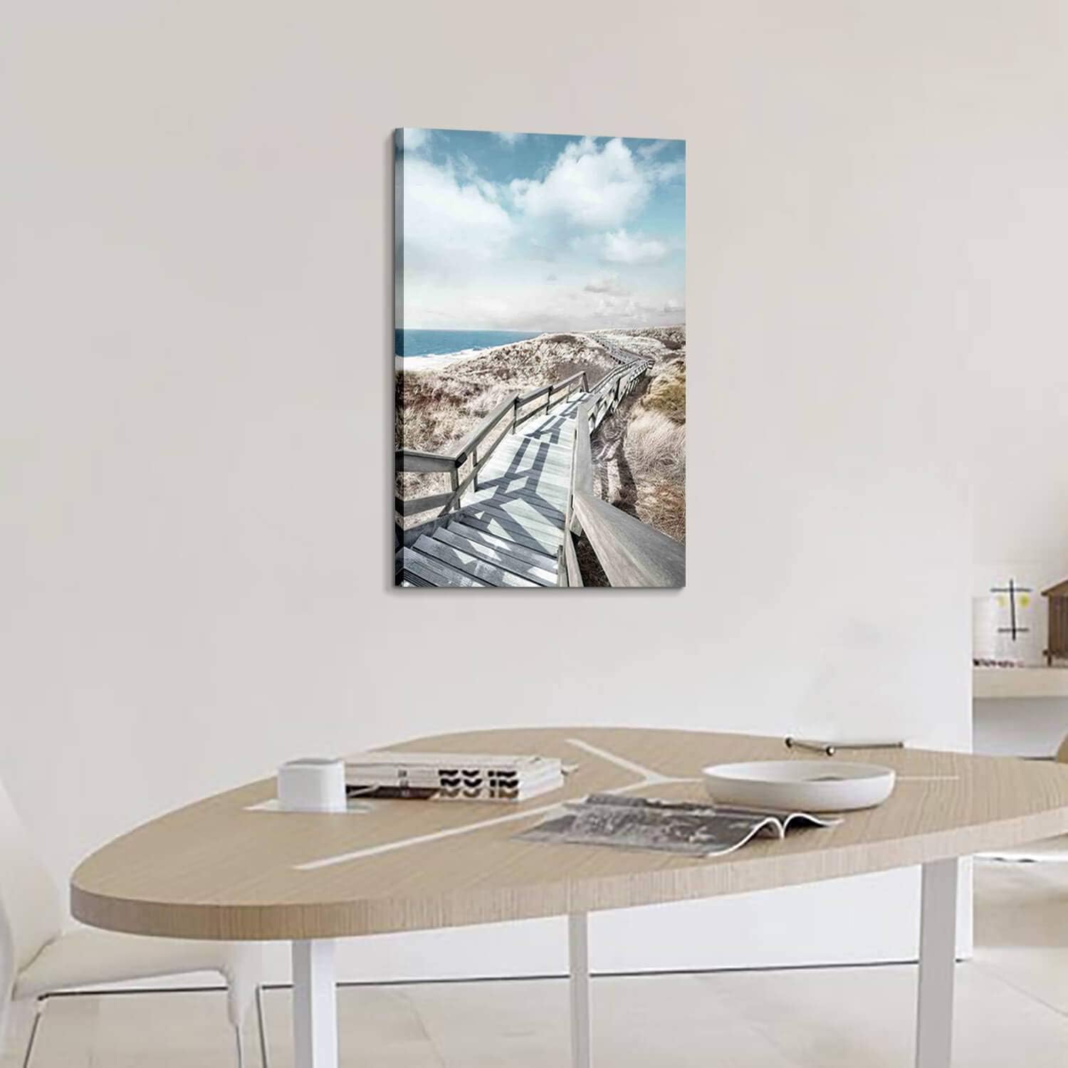 - Wooden Path to Beach Canvas: The sunny rustic fence boardwalk to the beautiful shore, enjoy this walk to the coastal artwork for walls in your home or office