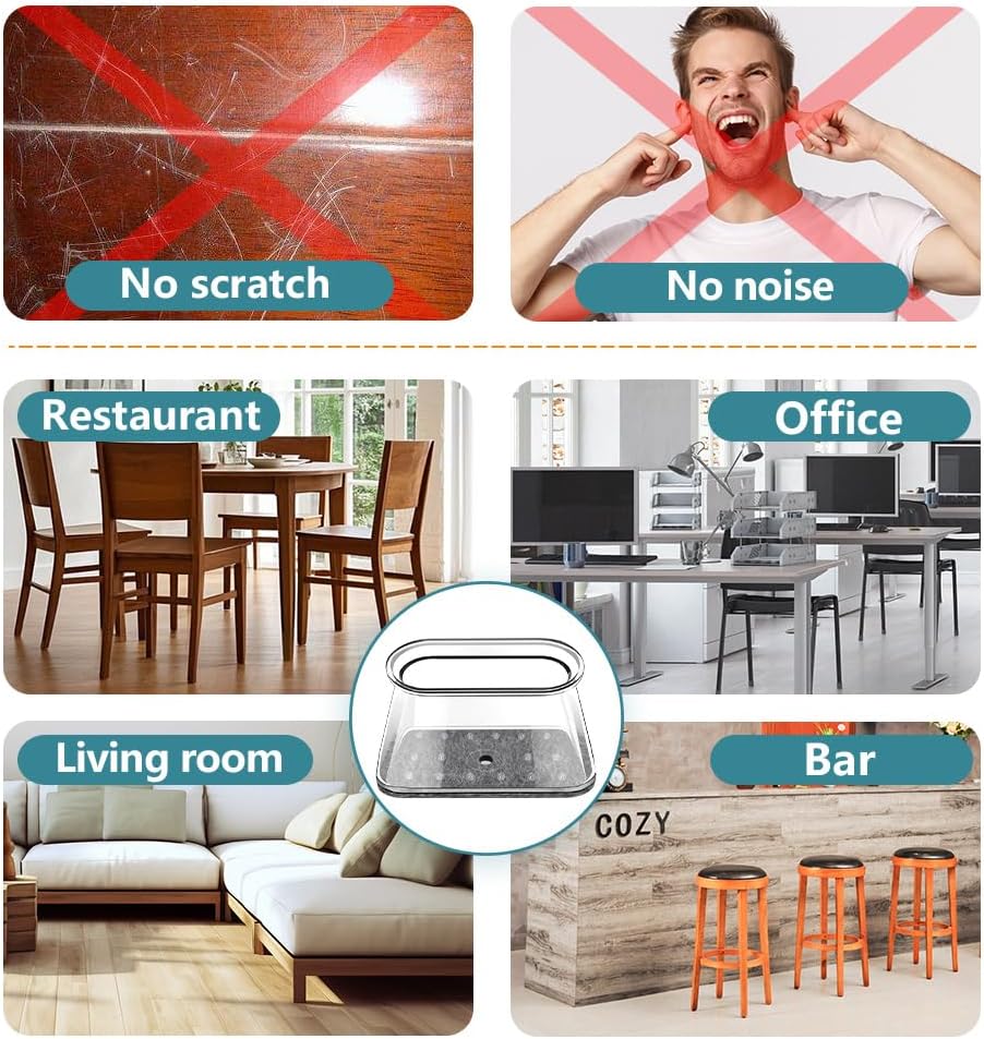 - 【Noise Reduction on Smooth Hard Floors】 Depending on what type of flooring you have, your chair scrapping against its surface can sound worse than nails on a chalkboard. These chair leg protectors help reduce noise by allowing your chairs to glide more quietly over hard floors.