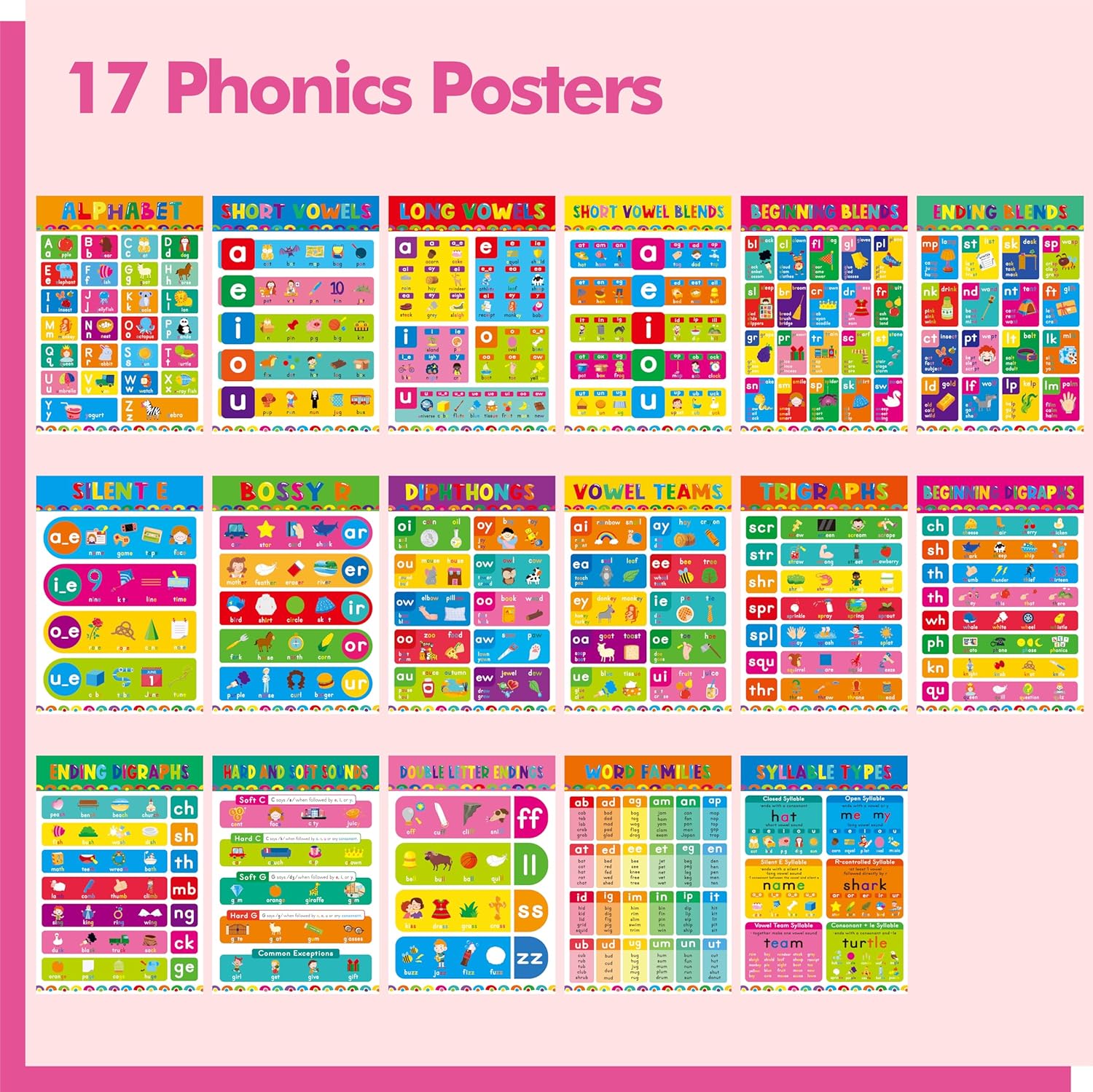 - Early Education: It comes with 17 phonics posters, including alphabet, short vowels, long vowels, beginning blends, silent E, bossy R, diphthongs, trigraph, word families, syllable types, and so on. These charts are designed to simplify complex phonics rules into kid-friendly visuals, making learning engaging and effective. Perfect for kindergarten, 1st grade, and ESL classrooms.