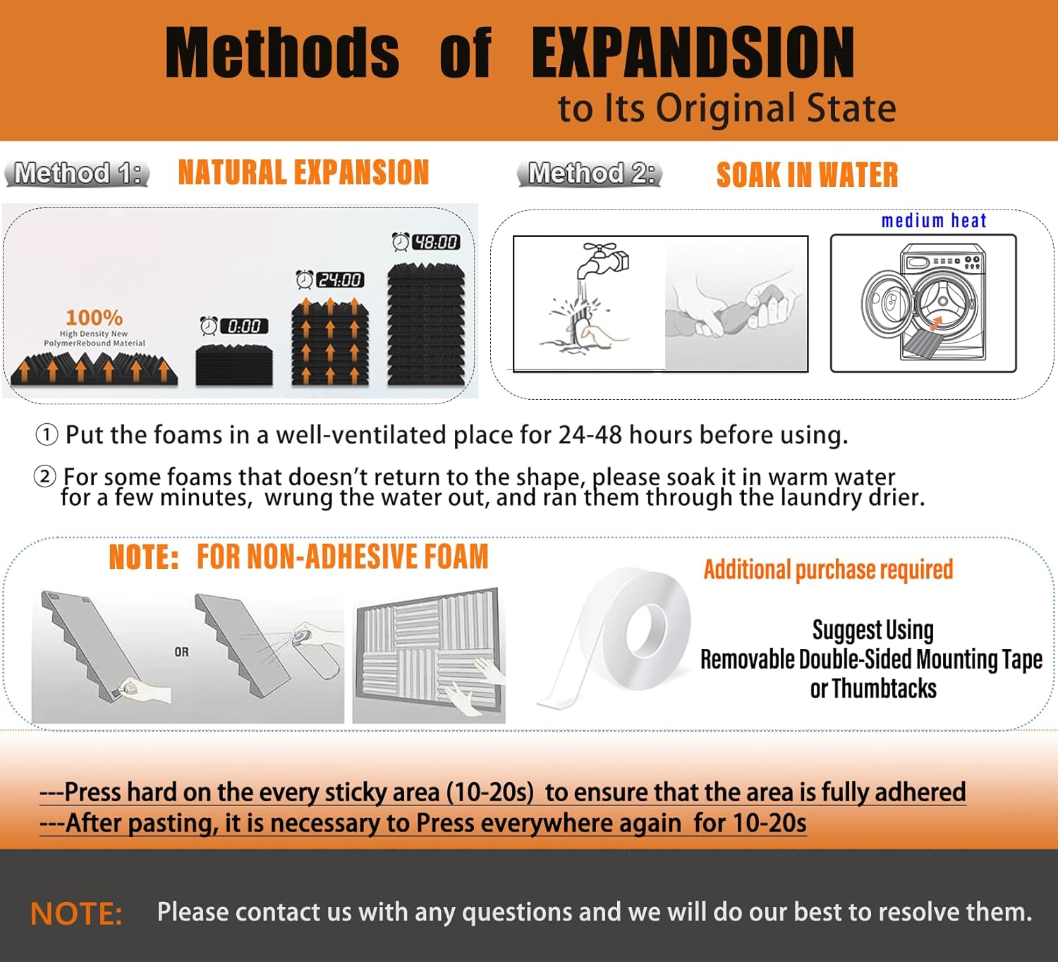 - Sound Insulation Soundproof Foam. - We sell noise cancelling foam panels are non-adhesive. So We recommend using 3M Double Sided Foam Tape that with strong adhesive or pin to install them. Perfect for home studios, offices, gaming rooms, and more, these panels can also good to diy ,you can cut to fit custom shapes and sizes. Please note: Products are packaged in a compressed state.For some products that cannot expand well, they will take longer to expand naturally. Or just put the product in the dryer for a few minutes to expand it to its original shape.